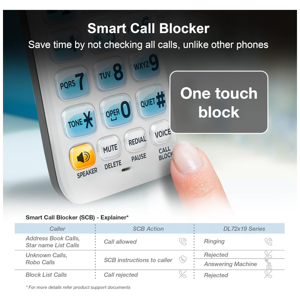 Bloqueador de chamadas inteligente diga adeus às chamadas indesejadas. Robocalls em seu telefone fixo são bloqueados automaticamente e nunca mais tocam mesmo na primeira vez. Diretório de bloqueio de chamadas de até 1.000 nomes e números.