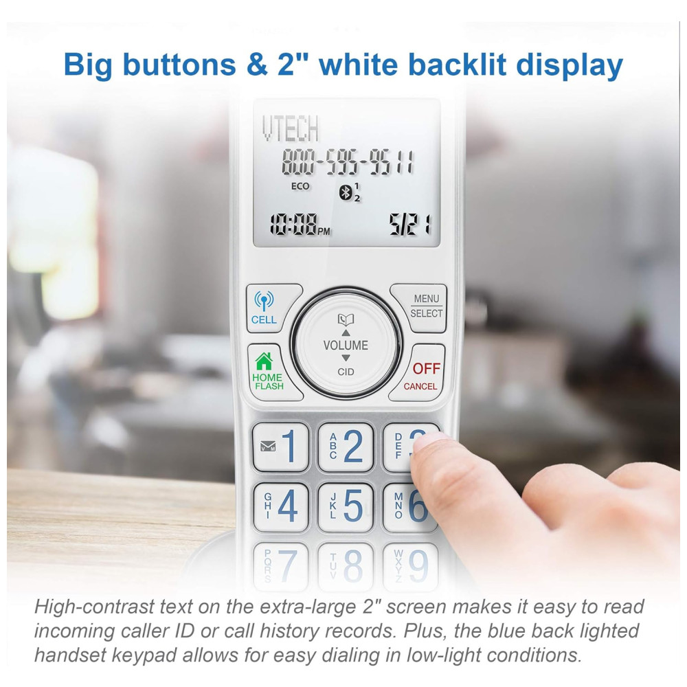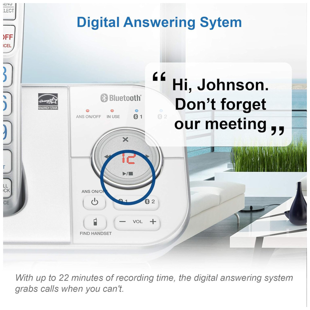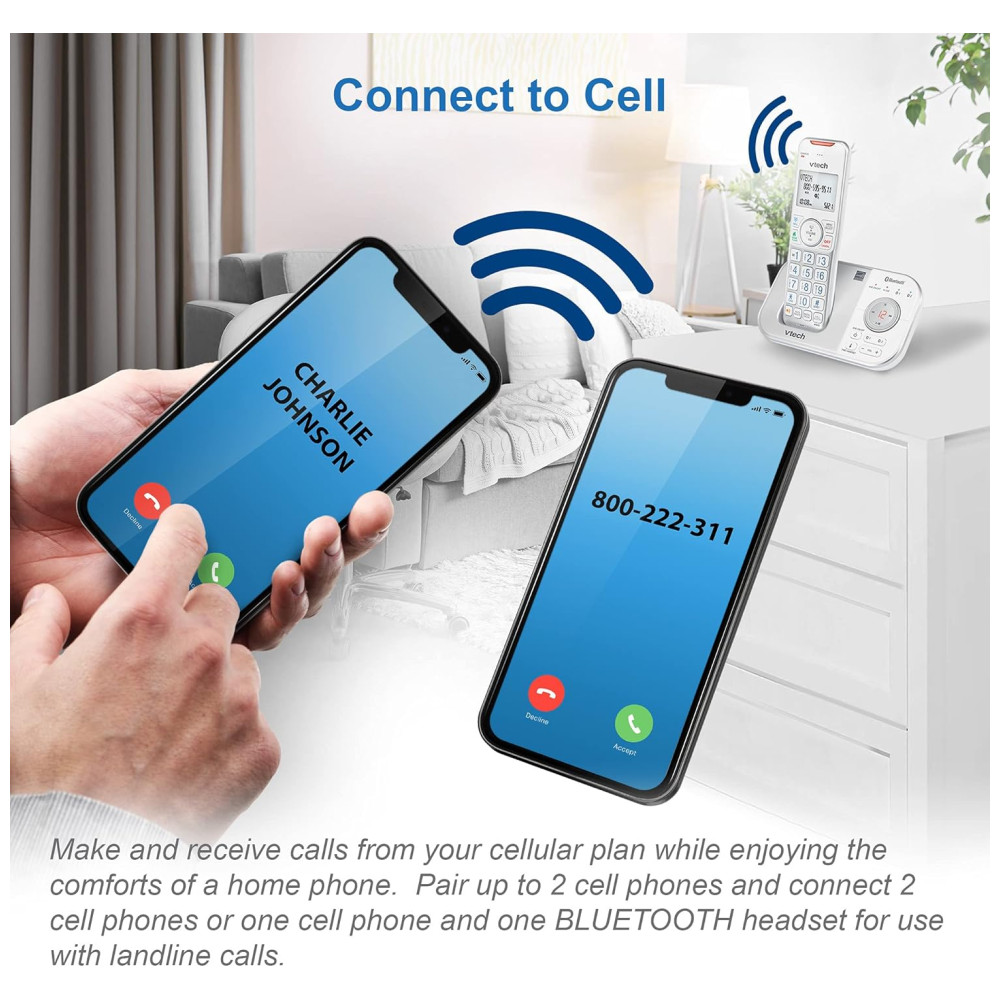BLUETOOTH CONNECT TO CELL Faça e receba chamadas do seu plano de celular enquanto desfruta do conforto de um telefone residencial. Emparelhe até 2 telefones celulares e conecte 2 telefones celulares, ou um telefone celular e um fone de ouvido BLUETOOTH para uso com chamadas para telefones fixos. Com o toque de um botão, aproveite os benefícios de alta tecnologia que seu smartphone oferece. Mesmo que o seu smartphone esteja em uma sala diferente, você ainda pode acessar a Siri ou o Google Now a partir dos telefones sem fio. Faça uma chamada, escreva ou leia um texto e execute todas as outras ações que esses serviços oferecem.