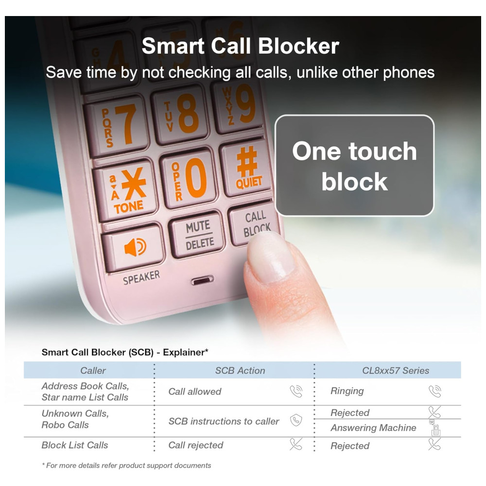 BLOQUEADOR DE CHAMADAS INTELIGENTE E ANÚNCIO DE ID DE CHAMADAS Diga adeus às chamadas indesejadas. As chamadas robóticas em seu telefone fixo são automaticamente bloqueadas para não tocar mesmo na primeira vez. Você também pode colocar permanentemente na lista negra qualquer número que desejar com um toque na tecla delicada do aparelho. O diretório de bloqueio de chamadas pode zenar até 1.000 entradas de nome e número. Além disso, o aparelho anuncia o nome de quem está ligando, para que você possa decidir atender a chamada ou bloqueá la rastrear a chamada nunca é tão fácil.