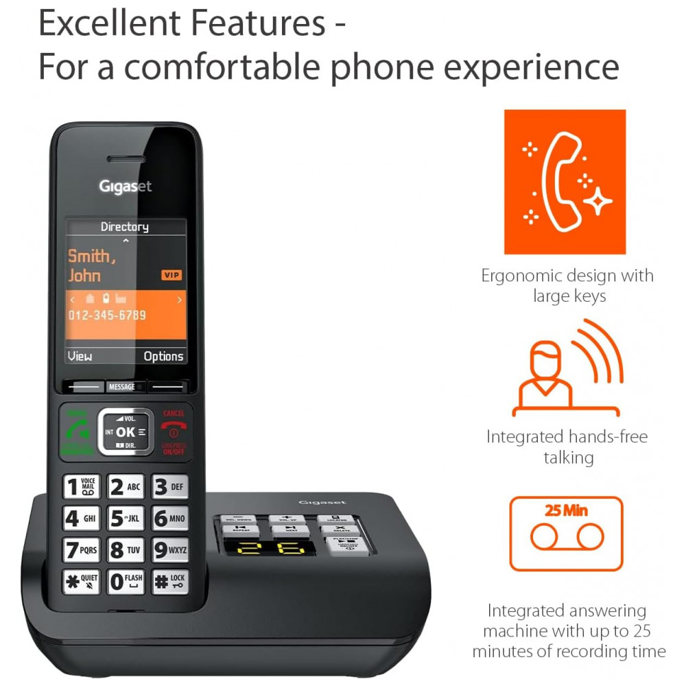 Fabricado na Alemanha pela Gigaset, o modelo apresenta design ergonômico em titânio/preto com materiais resistentes, clipes de cinto nos handsets e baterias AAA recarregáveis para autonomia de até 15 horas em conversação.
