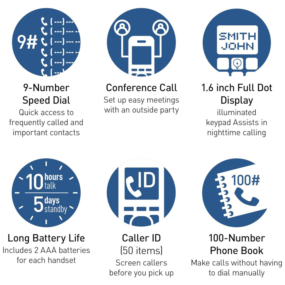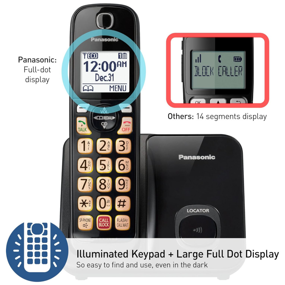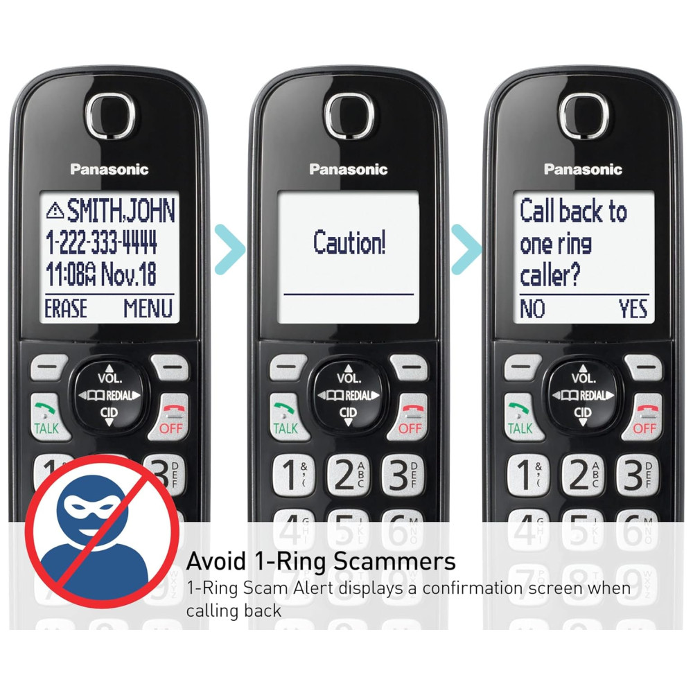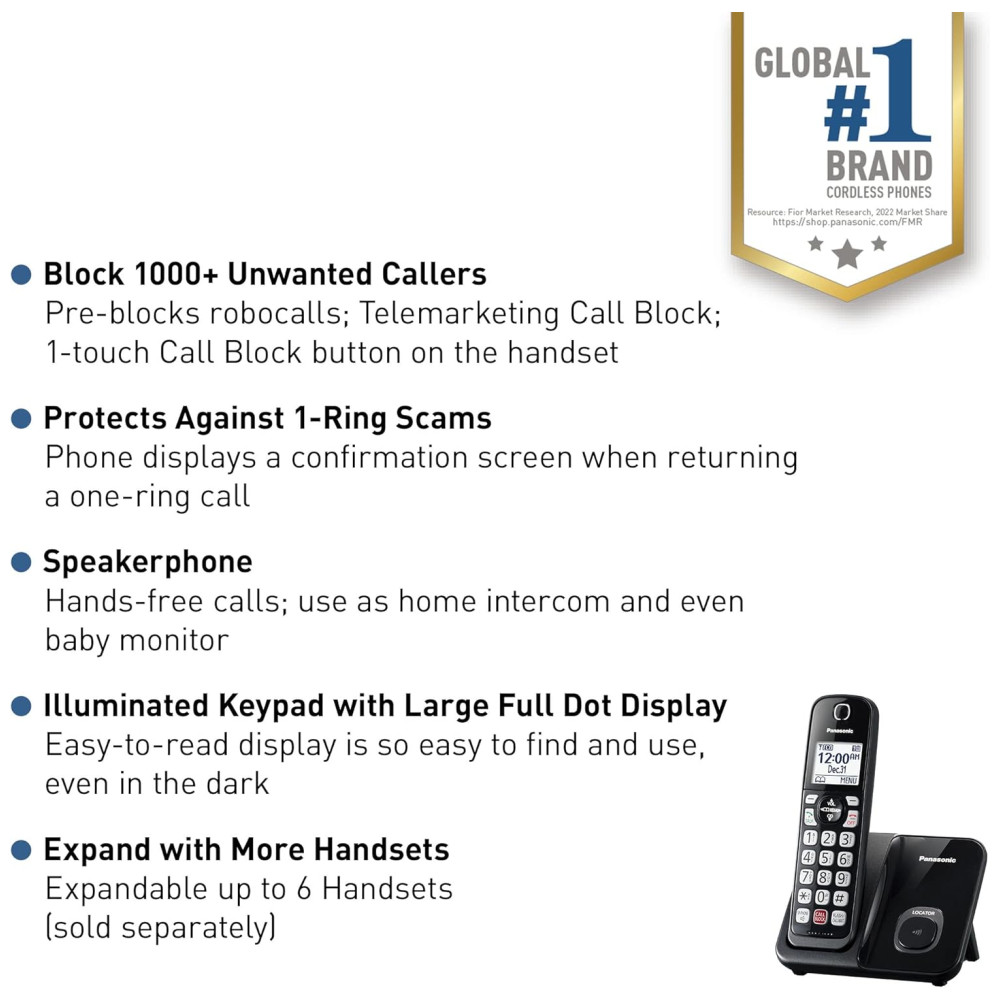 O Sistema de Telefone Residencial sem Fio Panasonic com Bloqueio Fácil de Chamadas. Facilite o trabalho em casa e livre-se do estresse parando chamadas indesejadas em 1 passo. Expansível para 6 monofones, o KXTGD810B é equipado com recursos inteligentes de Bloqueio de Chamadas para evitar chamadas indesejadas e golpistas, oferecendo muitos outros recursos para conveniência do dia a dia. Bloqueio de Chamadas Avançado: Bloqueio Automático de Chamadas pré-bloqueia chamadas robóticas; Bloqueio de Chamadas de Telemarketing permite bloquear chamadores anunciados; bloqueie mais 1.000 números com o botão de Bloqueio de Chamadas de 1 toque no monofone. Alerta de Golpe OneRing: Protege contra golpes de uma chamada ao exibir uma tela de confirmação ao retornar uma chamada de um toque. Funções de Viva-Voz que Simplificam Sua Vida: Viva-voz de duplex completo permite que você use seus monofones sem as mãos; use o monofone e a unidade base em viva-voz para um sistema de intercomunicação residencial; mantenha um monofone no quarto do bebê para usar como monitor. Fácil de Encontrar e Usar: Teclado iluminado com caracteres grandes e fáceis de ler é fácil de encontrar e ler, mesmo no escuro; discagem rápida dá acesso com 1 toque aos 9 números mais discados; design para montagem na parede mantém o telefone sempre próximo e confiável. Bateria de Longa Duração: Aproveite até 10 horas de tempo de conversação e 5 dias em modo de espera no modo eco. Identificador de Chamadas para 50 itens permite que você filtre chamadas eficientemente; agenda telefônica para 100 itens garante que você possa ligar para qualquer pessoa rapidamente.