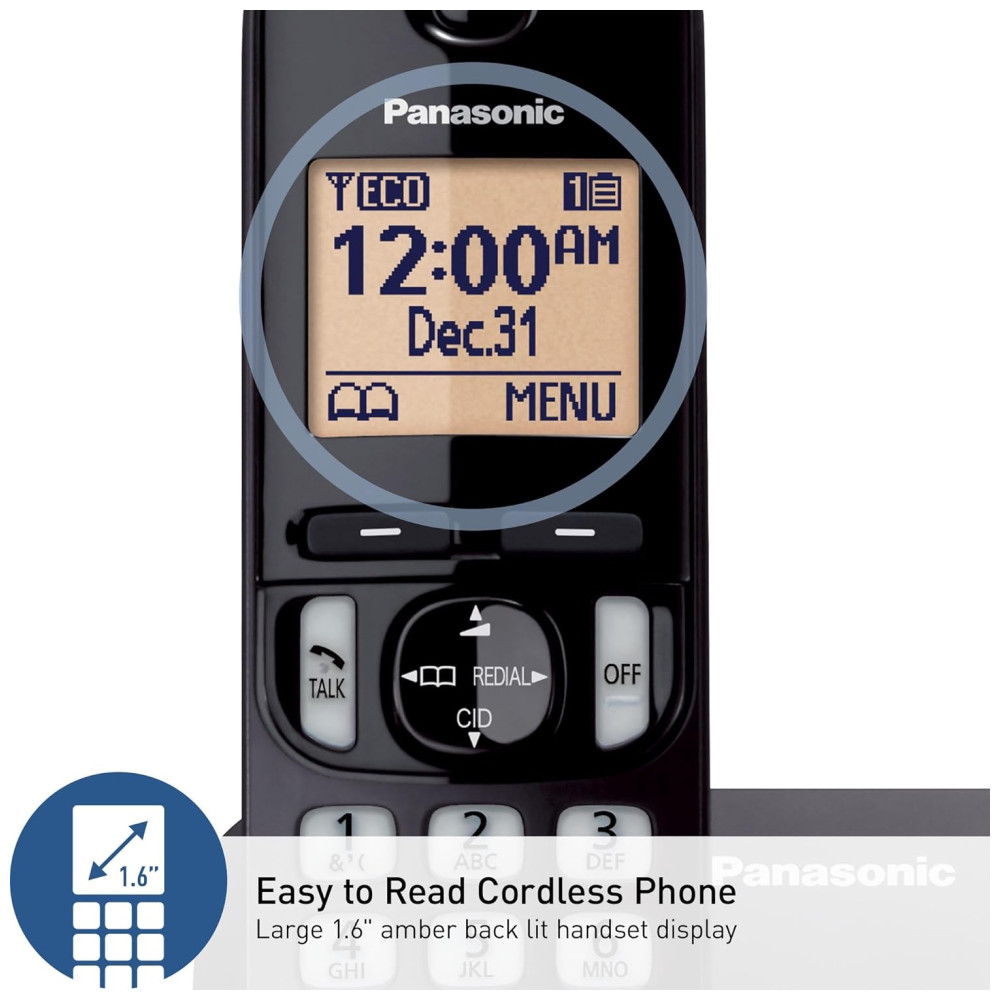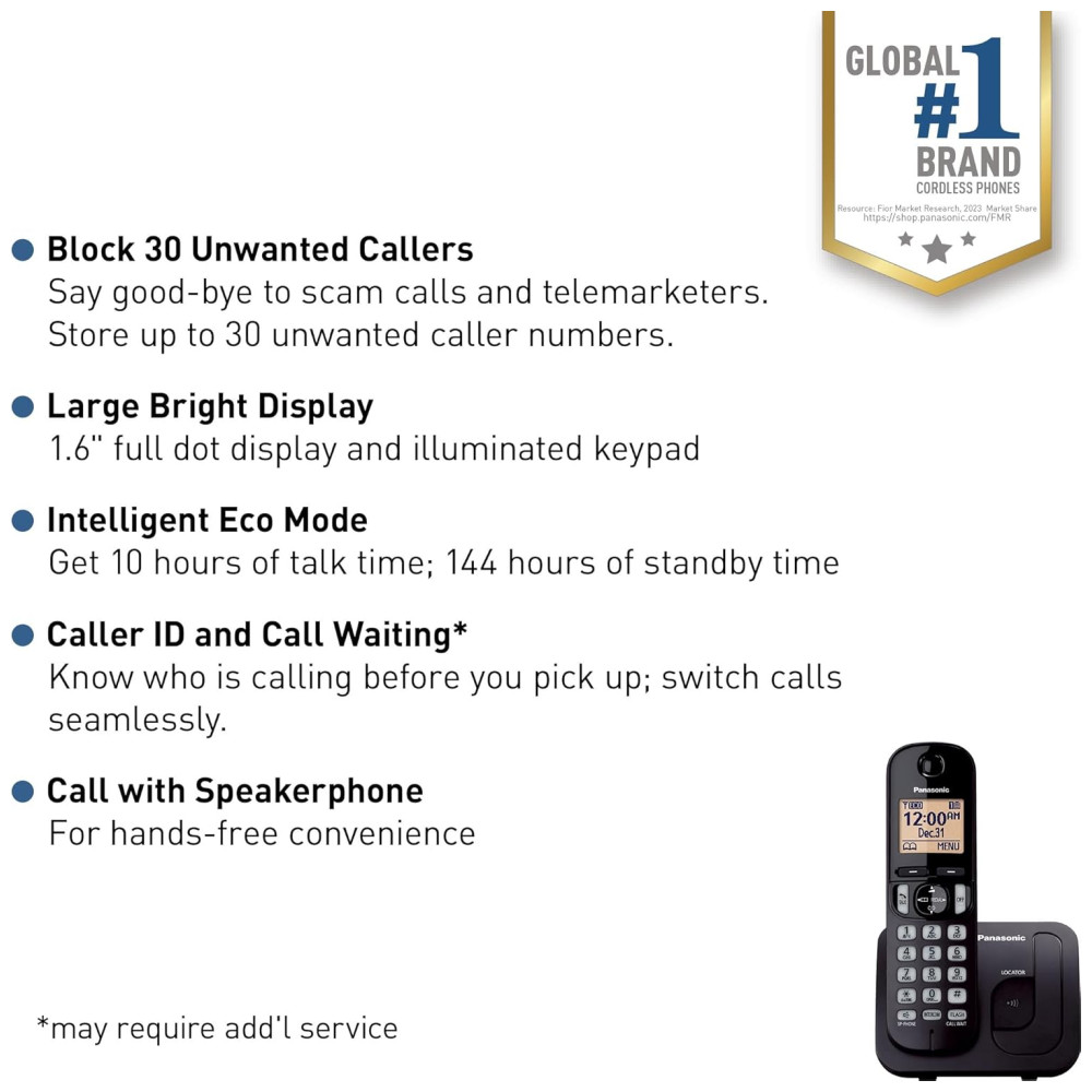 O telefone sem fio Panasonic KXTGC200 é um aparelho de telefone fixo confiável com recursos que tornam o dia a dia muito mais fácil. Seu amplo display retroiluminado em âmbar oferece uma leitura excepcional, mesmo em ambientes com pouca luz, facilitando as chamadas noturnas. Sua tela clara e iluminada permite que você navegue pelos menus, disque números e veja o identificador de chamadas com facilidade. Além disso, o recurso de Bloqueio de Chamadas permite que você bloqueie permanentemente até 30 números indesejados, oferecendo maior controle sobre suas chamadas e tranquilidade. Desfrute de longas conversas com até 10 horas de tempo de conversação e 144 horas em standby. O Modo Eco Inteligente otimiza o consumo de energia, garantindo uma vida útil mais longa da bateria e reduzindo o uso de energia, tornando-o prático e ecologicamente correto. O viva-voz do monofone adiciona mais conveniência, permitindo comunicação sem as mãos. Seja trabalhando, cozinhando ou simplesmente relaxando, você pode ter conversas claras e confiáveis sem precisar segurar o monofone, garantindo conforto e eficiência multitarefa. Unidade base e um monofone sem fio incluído. Fácil de encontrar e usar – com um amplo display retroiluminado em âmbar de 1,6″, garantindo fácil leitura, mesmo em ambientes com pouca luz; bloqueie facilmente até 30 números indesejados com o Bloqueio de Chamadas; bateria duradoura com até 10 horas de conversação e 144 horas em standby; Modo Eco otimiza o uso de energia; viva-voz para comunicação sem as mãos, proporcionando maior conveniência; comunicação clara em qualquer lugar de sua casa, com tecnologia DECT 6.0 para um sinal forte e claro onde quer que você esteja.