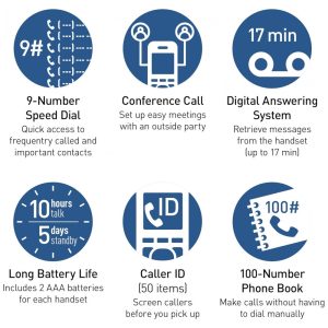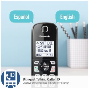 A secretária eletrônica digital suporta 17 minutos de gravação, com Caller ID bilíngue inglês/espanhol falado e comandos de voz para atendimento mãos-livres. O handset possui teclado iluminado com caracteres grandes, discagem rápida para números favoritos, viva-voz e conferência de 2 vias, com autonomia de 10 horas em conversação e 120 horas em standby.