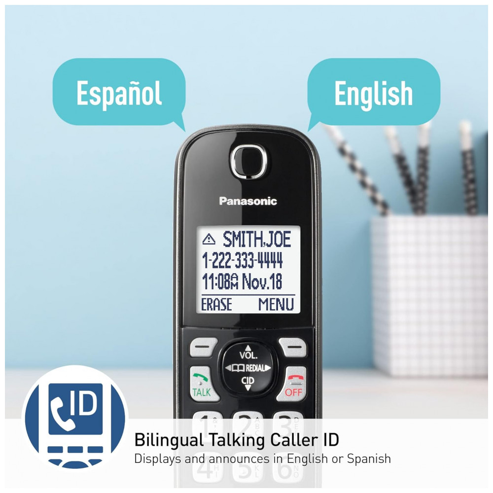A secretária eletrônica digital armazena até 17 minutos de mensagens, com identificação de chamadas (Caller ID) bilíngue inglês/espanhol com anúncio falado e comandos de voz para atendimento mãos-livres. Os handsets contam com teclado iluminado de caracteres grandes, discagem rápida para números favoritos, viva-voz e conferência de 2 vias, suportando 10 horas de conversação e 120 horas em standby.
