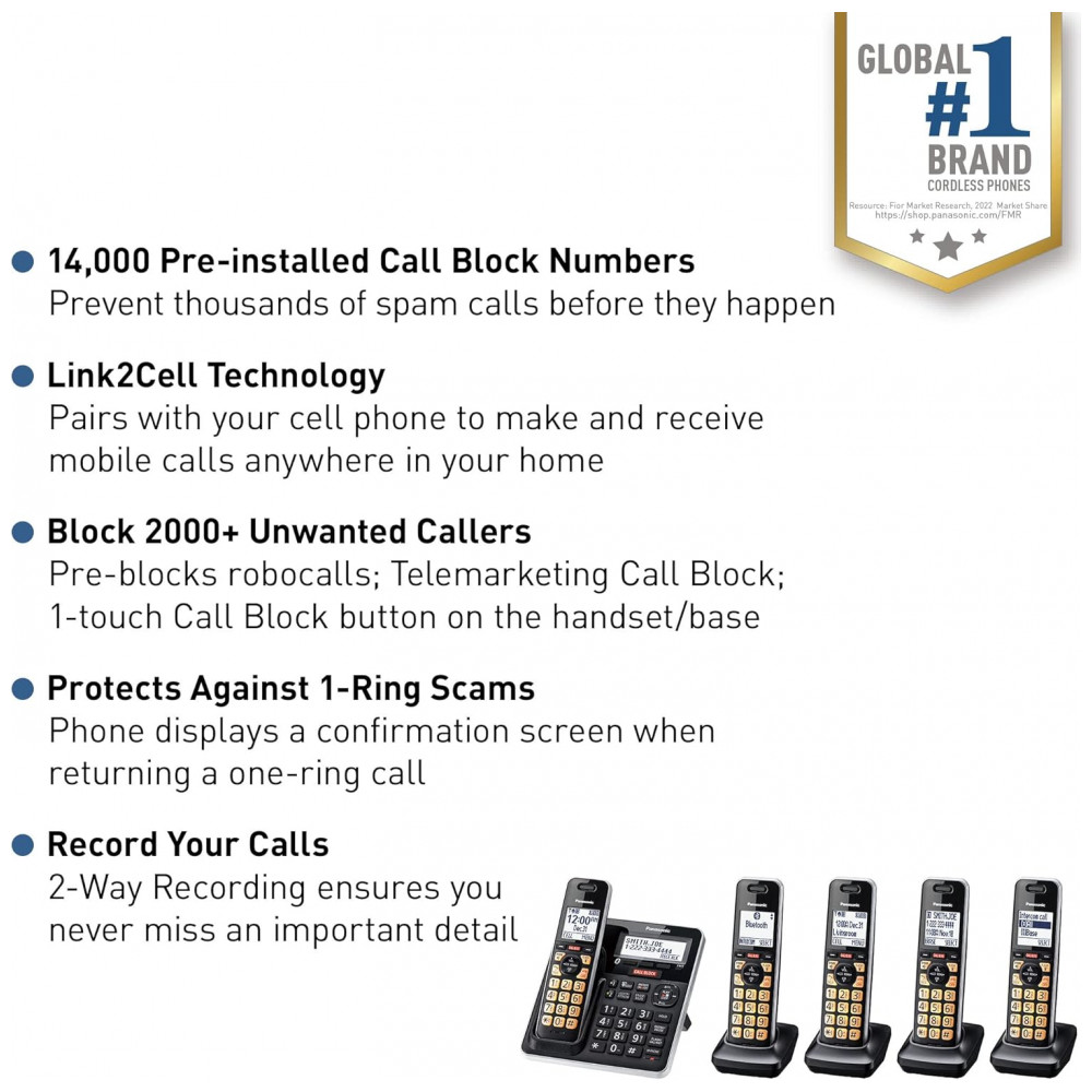 Telefone Sem Fio Panasonic KX-TGF975B Preto/Prata com 5 Handsets Link2Cell Bluetooth Bloqueio Avançado de Chamadas Gravação Bidirecional Secretária Digital 18 Minutos