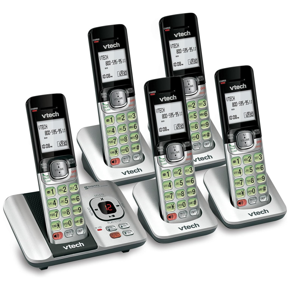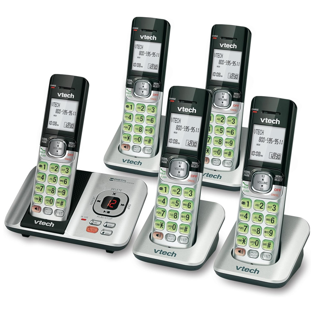 Telefone sem fio VTech CS65295 com 5 ramais Atendimento Automático Identificador de Chamadas Viva-Voz Montagem em Parede Display LCD – Prata/Preto