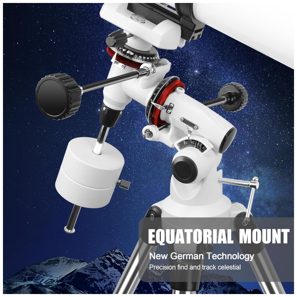 Montagem Equatorial Alemã: Equipado com uma montagem equatorial alemã pré-montada, com escalas graduadas e cabos de movimento lento para ajustes precisos. Projetado para observação de corpos celestes e paisagens terrestres (imagem invertida, sem impacto na observação astronômica).