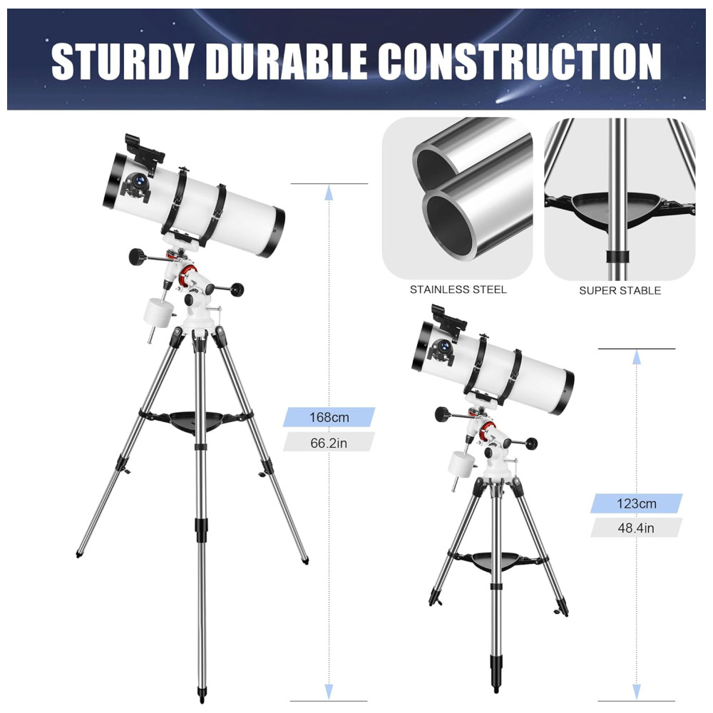Grande Abertura de 150 mm: O telescópio refletor 150EQ possui uma abertura de 150 mm e distância focal de 650 mm, proporcionando excelente captação de luz e imagens nítidas e detalhadas. Ideal para adultos, crianças, iniciantes e astrônomos experientes.