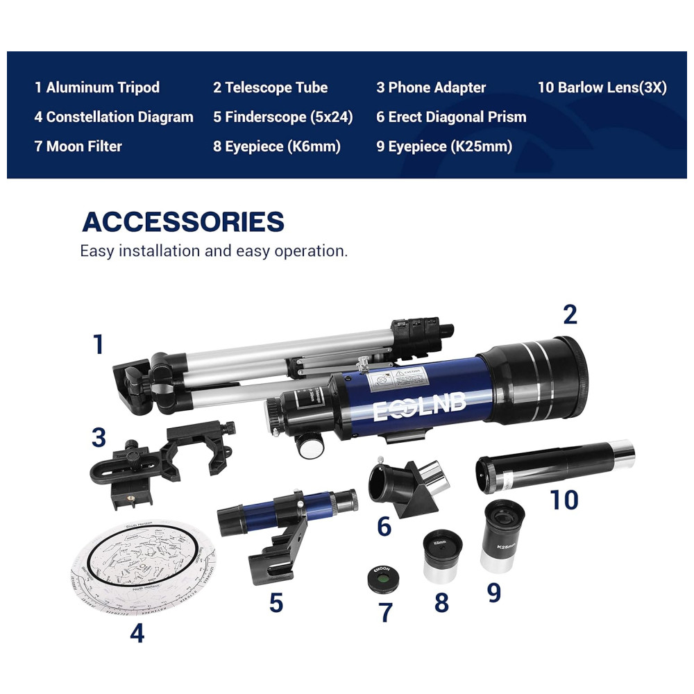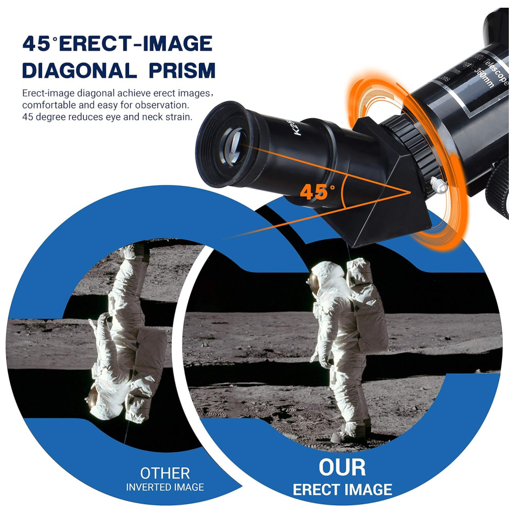 Alta ampliação Com a última geração de duas K6mm, K25mm oculares Kellners intercambiáveis de 1,25, o telescópio infantil é melhor do que as oculares Huygens. A lente Barlow 3X triplica o poder de ampliação de cada ocular, para que você possa obter uma ampliação de 15X a 180X .