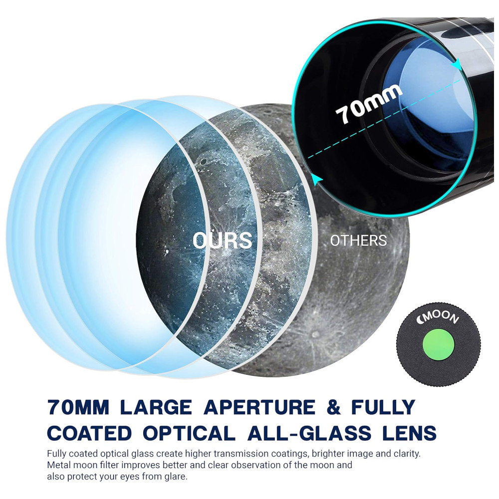 Abertura grande de Equipado com abertura de e distância focal de , o telescópio adulto iniciante aumenta a transmissão de luz e fornece imagens mais nítidas. O vidro óptico totalmente multirrevestido com revestimentos de alta transmissão cria imagens nítidas com maior brilho e clareza.