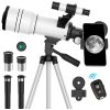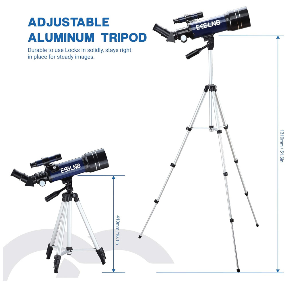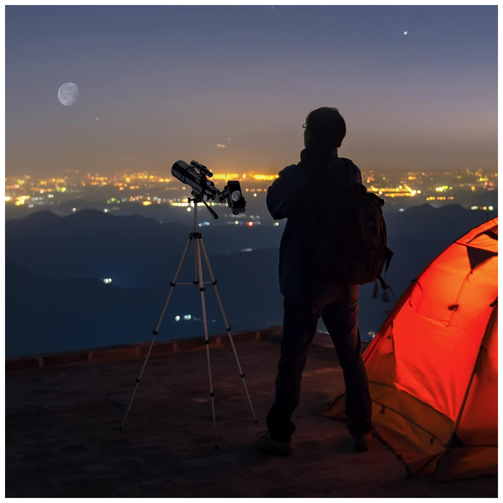 Adaptador de telefone e tripé ajustável O telescópio refrator está disponível com um tripé de alumínio ajustável, que pode ajustar a altura de 40 a 130 centimetros. Telescópios astronômicos com adaptador de telefone permitem que você faça vídeos e imagens.
