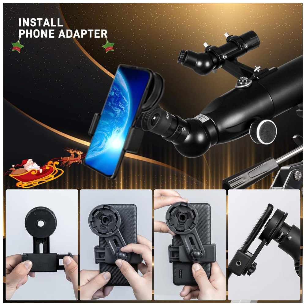 Presente poderoso de dia dos pais 28X 233X Este telescópio refrator está equipado com uma longa distância focal de . Vem com oculares K9mm e K25mm melhor que a ocular da série H, uma lente Barlow 3x e pode alcançar uma ampliação de surpreendentes 28 a 234 vezes. O escopo do localizador 5×20 torna a localização de objetos fácil e precisa. Um presente de aniversário exclusivo para ele, seu pai, papai, avô, pai em baixo ou padrasto.