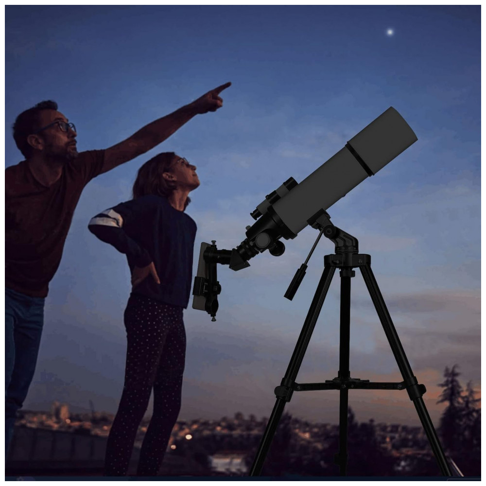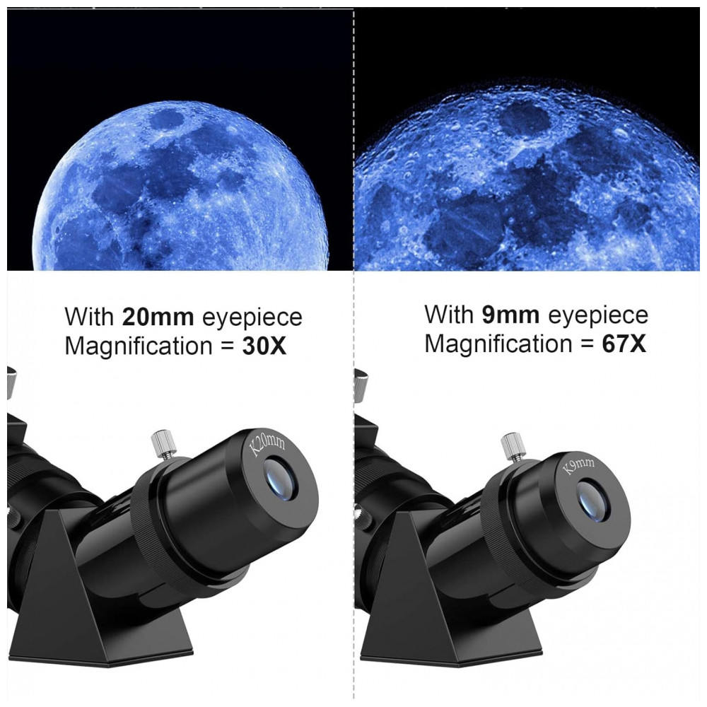 Todos os acessórios que você precisa Totalmente carregado com 2 oculares K20mm e K9mm com ampliações de 30x 66x, luneta 5×24 com mira para localizar os objetos facilmente. Equipamos este telescópio com um adaptador de celular personalizado. Suas duas posições finais são preparadas respectivamente para oculares K20 e K9, que podem localizar com rapidez e precisão a ocular e o telescópio. Você só precisa selecionar a ocular correspondente de acordo com as letras do adaptador a ser .