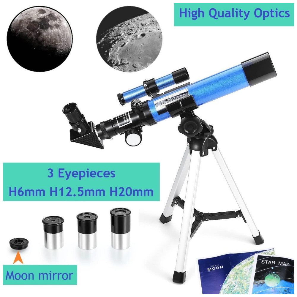 Telescópio lunar infantil F400X40 com espelho lunar Inclui 3 peças oculares intercambiáveis H20mm, H12.5mm, H6mm que você pode desfrutar de diferentes potências de ampliação.