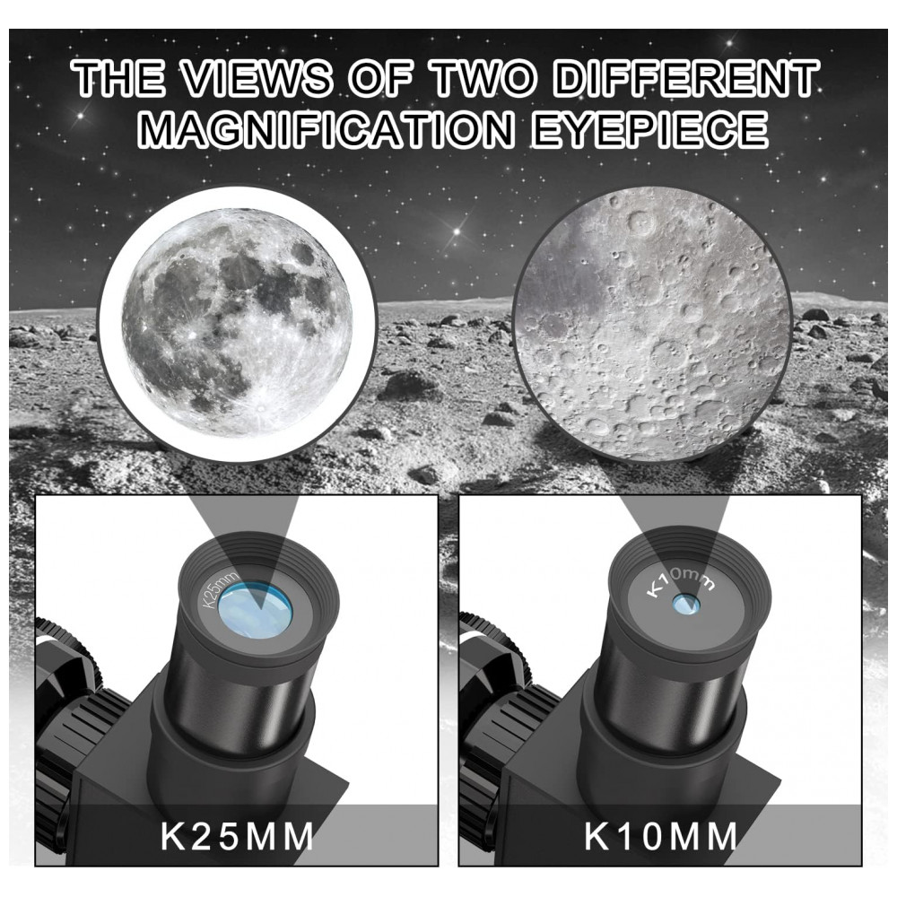 Inclui duas oculares de 1,25 K25mm e K10mm que você pode aproveitar a ampliação de 51X a 128X, e o 5X24 Finder Scope pode fazer com que o telescópio starscope localize objetos mais rapidamente.
