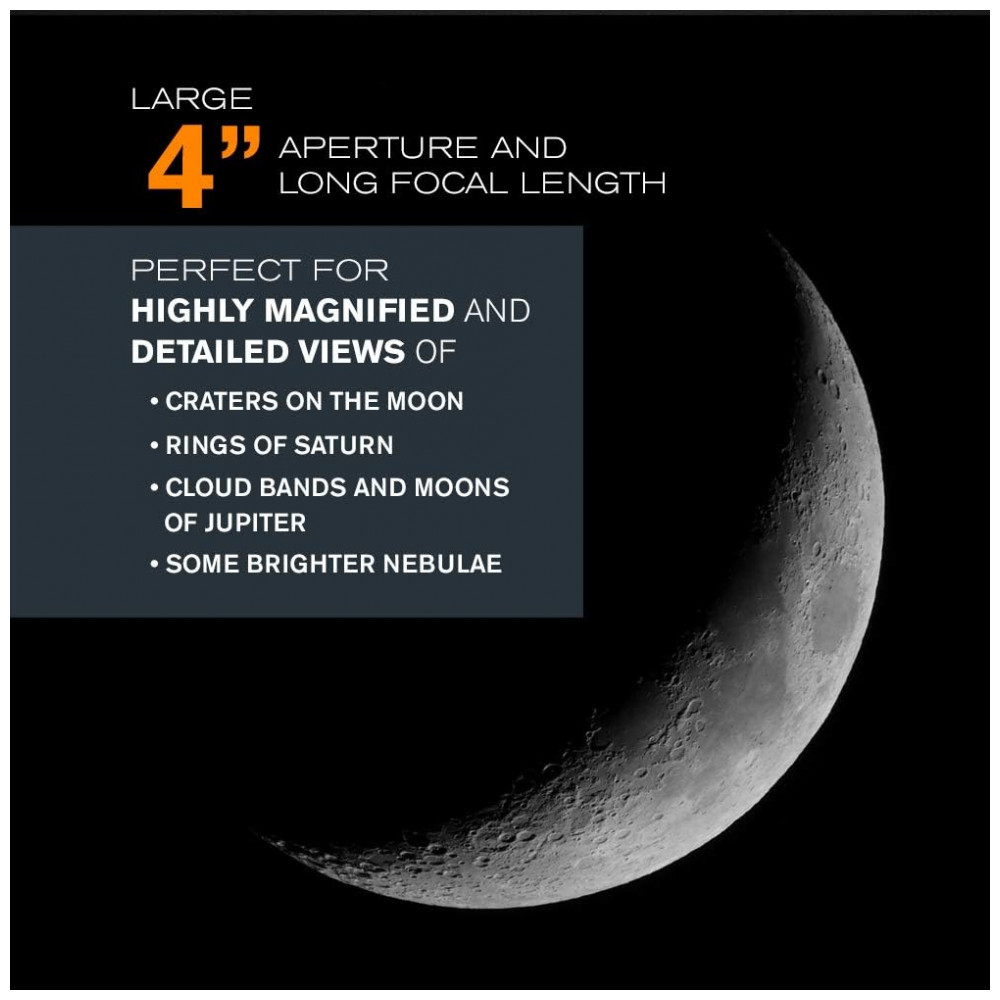 TELESCÓPIO MAKSUTOV CASSEGRAIN DE ABERTURA DE 4 POLEGADAS O espelho primário de 4 polegadas possui capacidade de captação de luz suficiente para fornecer vistas impressionantes da Lua e dos planetas, juntamente com objetos do céu profundo como a Nebulosa de Orion, mantendo um fator de forma compacto.