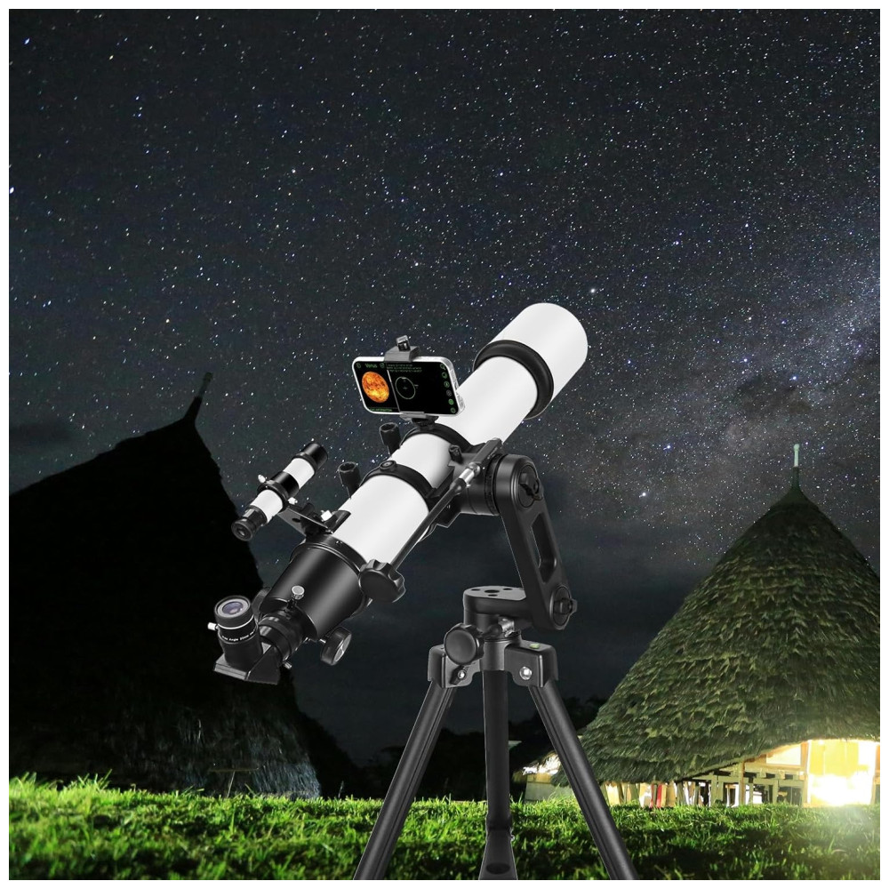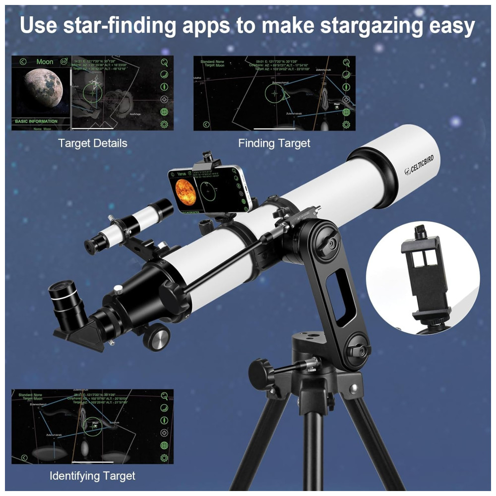 Adaptador e Suporte para Celular: O telescópio inclui adaptador e suporte para celular. Com o adaptador, é possível tirar fotos e vídeos incríveis de suas observações. O suporte ajuda a localizar estrelas. Basta instalar um aplicativo de observação, e você pode usar o celular para localizar corpos celestes como a Lua, planetas ou estrelas. O buscador 5×24 facilita a localização dos objetos.