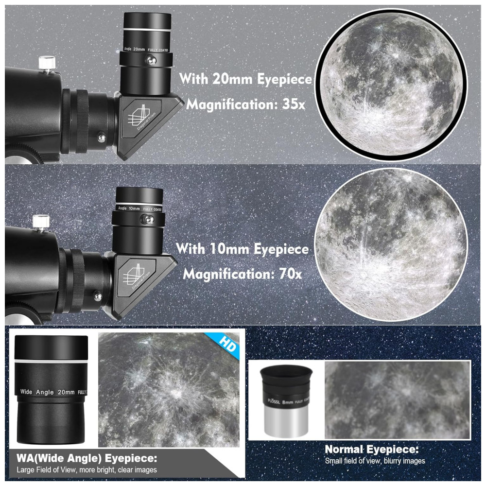 Adequado para Iniciantes e Profissionais: Este telescópio é ideal para adultos, crianças, iniciantes e profissionais. Seja para observar a Lua ou planetas, seu design fácil de usar e excelente desempenho óptico fazem dele uma excelente escolha para aprender e pesquisar astronomia. Um ótimo presente de astronomia para adultos, entusiastas, iniciantes e crianças de 8 a 12 anos.