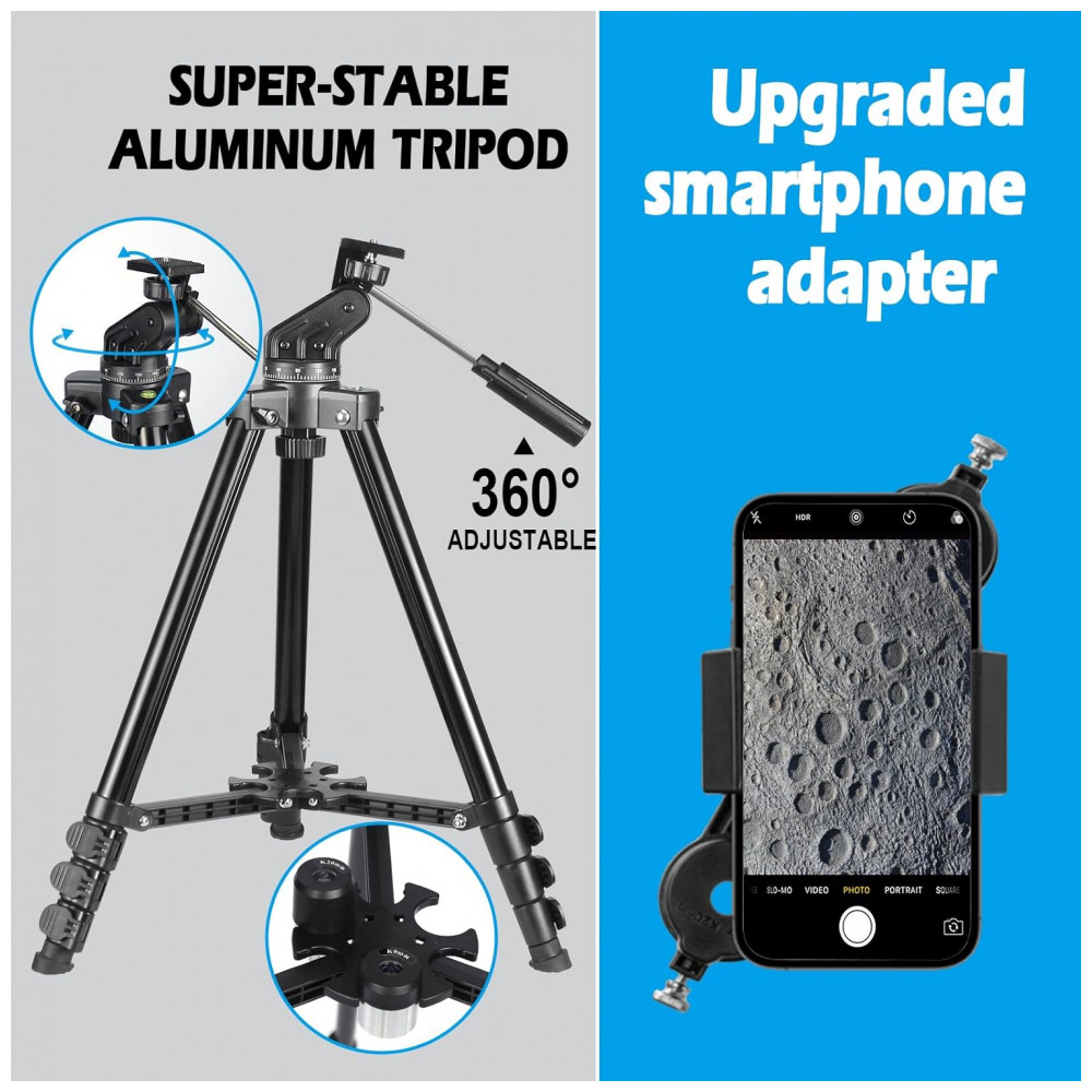 Portátil e Estável: Nosso telescópio refrator vem com uma bolsa traseira, um tripé de alumínio ajustável e um adaptador de telefone atualizado. Todos os acessórios podem ser embalados na bolsa, facilitando o transporte e armazenamento para viagens. O tripé é estável e sua altura pode ser ajustada de 45 a 132 cm, adequado para adultos e crianças. Com o adaptador de telefone, você pode tirar fotos incríveis através do seu celular.