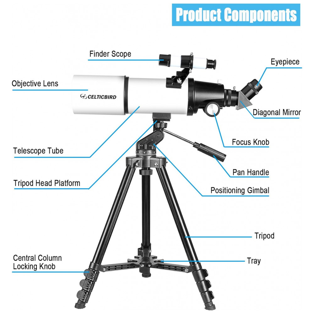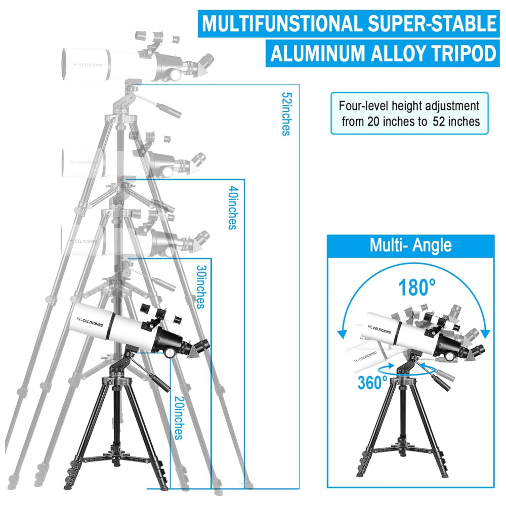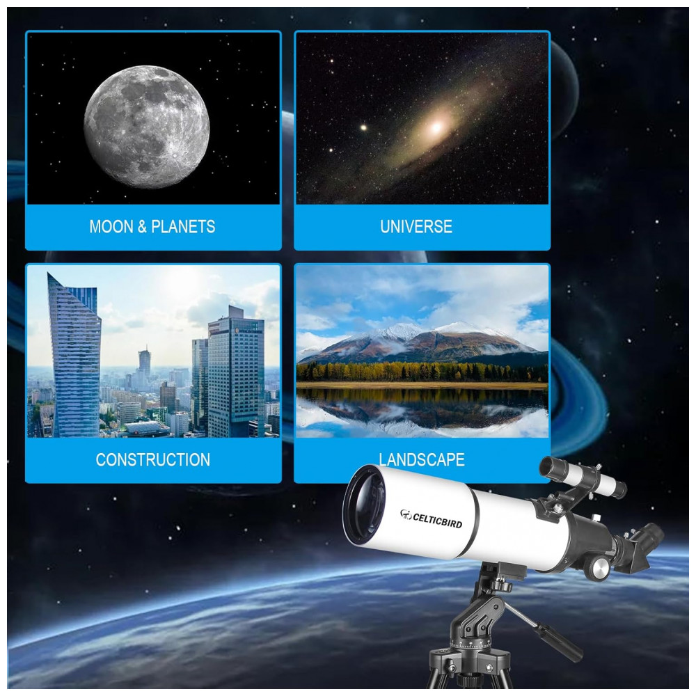 Telescópio Potente para Adultos 80mm Diâmetro e 600mm para Astronomia Ideal para Viagens e Iniciantes com Montagem AZ Celticbird.