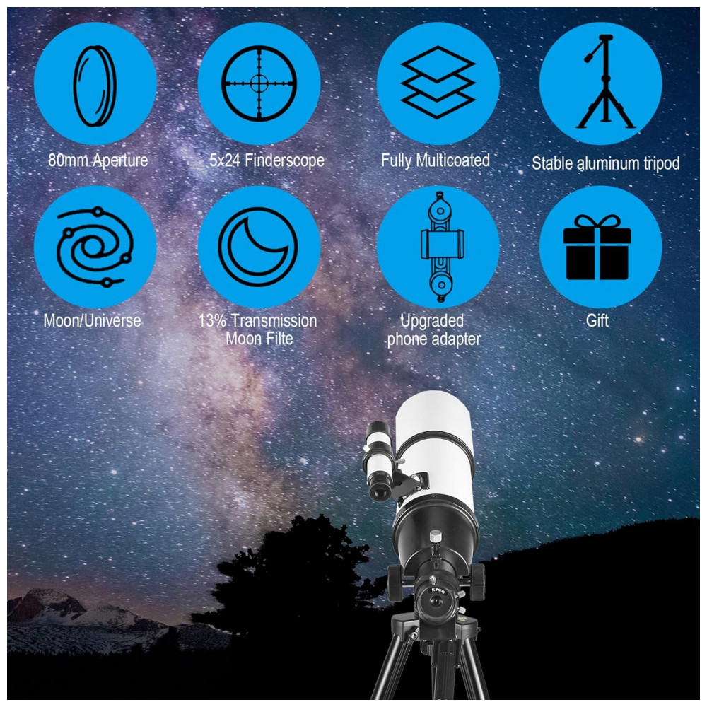 Excelente Ótica: O telescópio astronômico possui uma abertura de 80 mm e uma distância focal de 600 mm (f/6,7). A grande abertura captura mais luz, enquanto as lentes ópticas totalmente revestidas melhoram a transmissão da luz e reduzem o reflexo, proporcionando imagens mais brilhantes e claras.