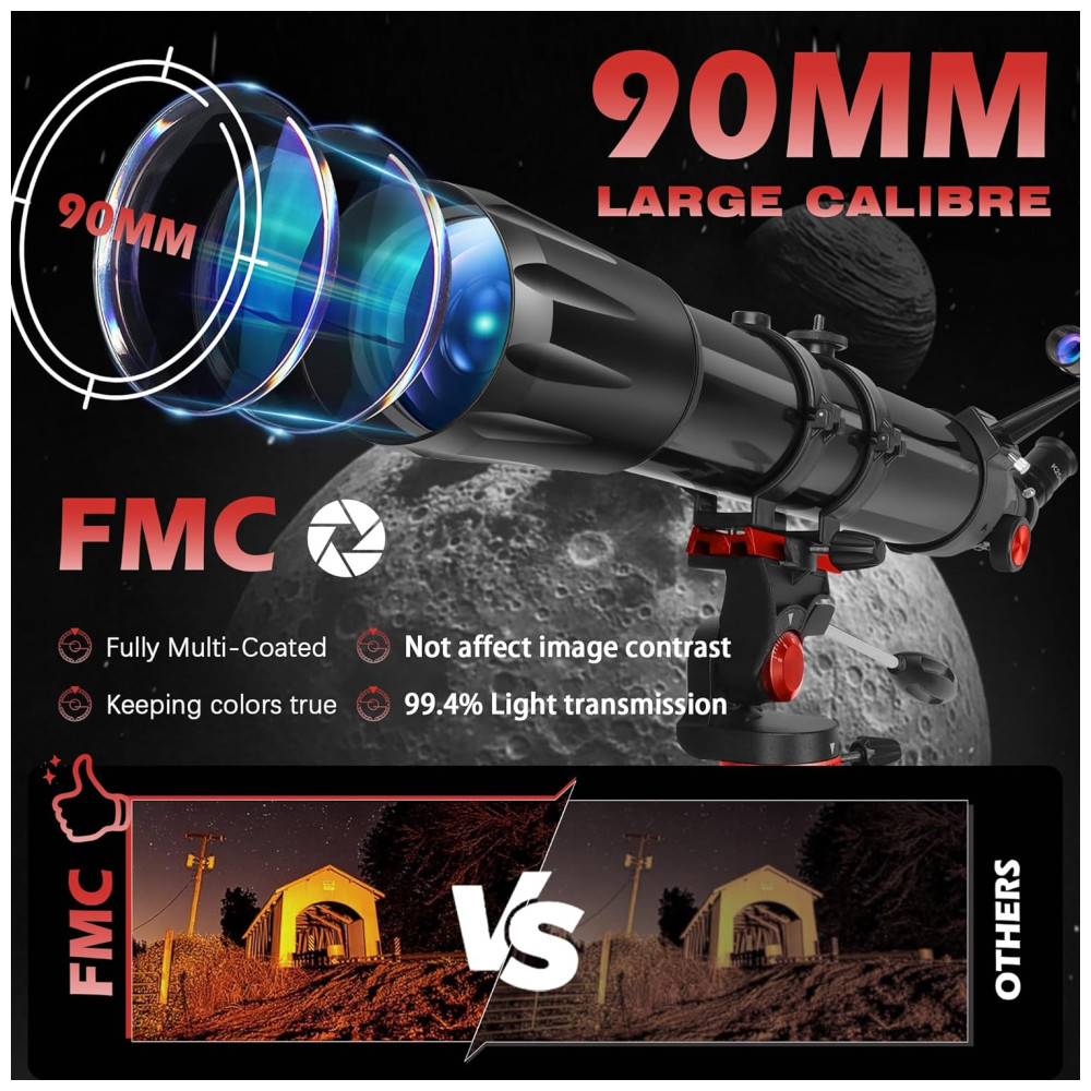 Abertura de 90 mm: Oferece excelente capacidade de coleta de luz para imagens mais brilhantes e impressionantes. As lentes de vidro óptico totalmente revestidas minimizam o reflexo da luz, proporcionando imagens deslumbrantes e protegendo seus olhos.