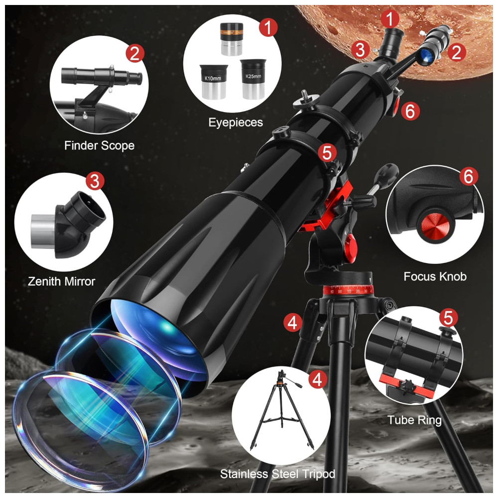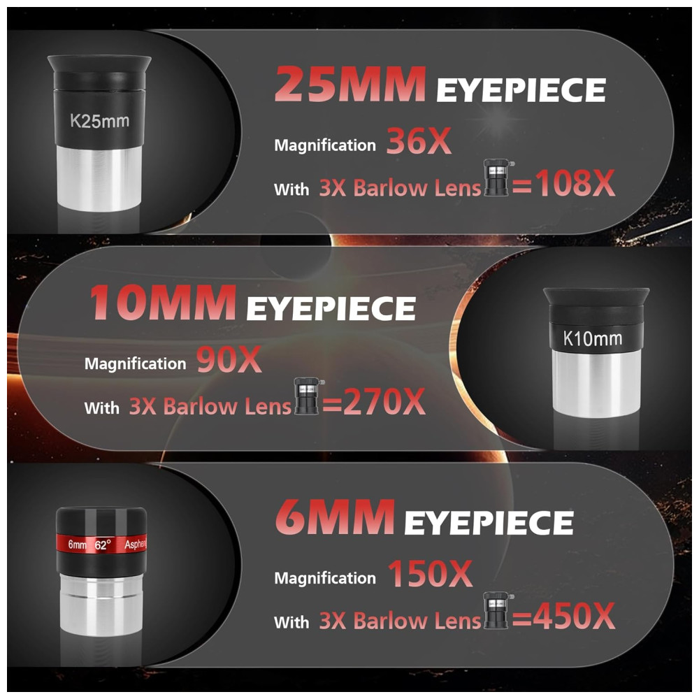 Ampliação de 36X a 450X: Equipado com três oculares (25 mm, 10 mm e 6 mm) e uma lente Barlow 3x, oferece ampliações de 36X a 450X com uma distância focal de 900 mm. Inclui um buscador de 5×24, adaptador de telefone e montagem para observação estelar.