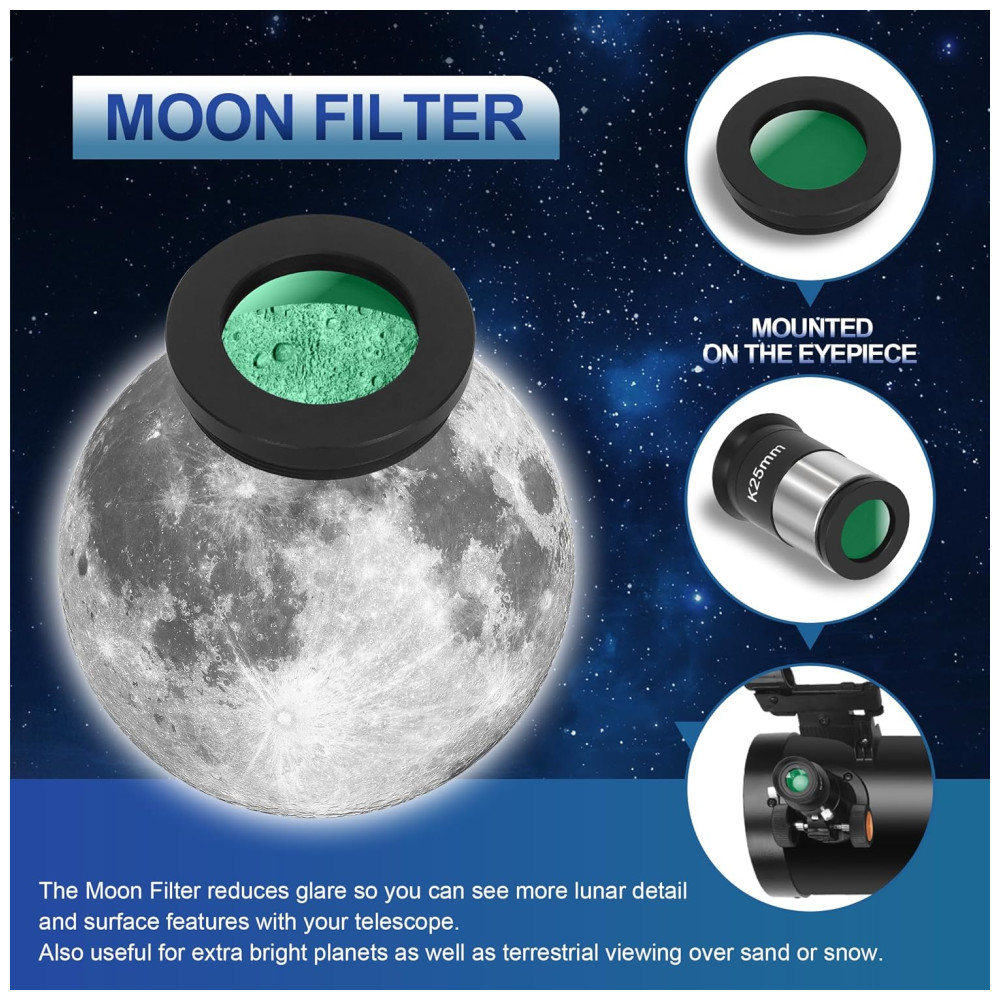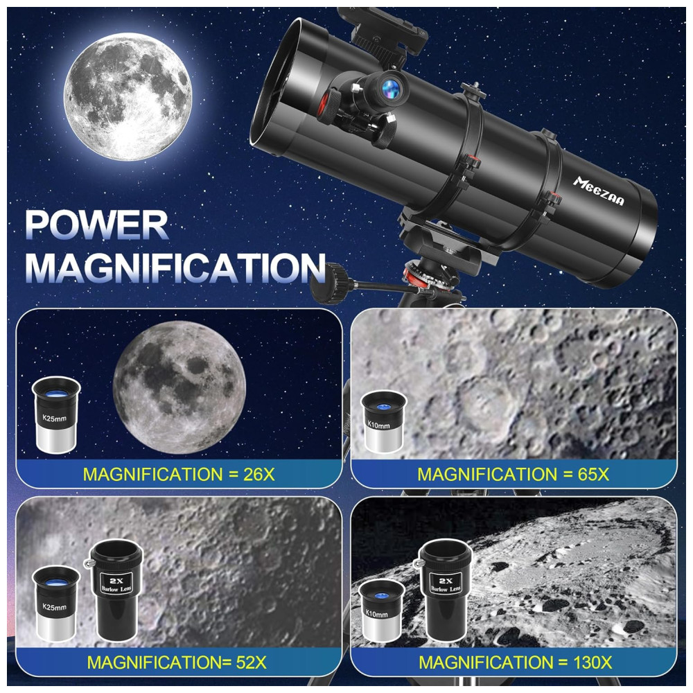 Equipado com dois oculares de alta qualidade (25 mm e 10 mm) e uma lente Barlow 2x, permitindo ampliações de até 26x ou 130x. O buscador de ponto vermelho facilita a localização de objetos, enquanto o filtro lunar reduz o brilho e protege os olhos.