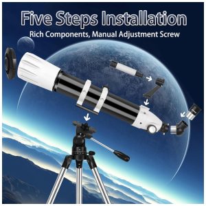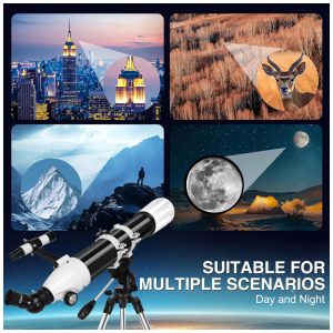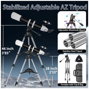 Flexível, Estável e Portátil: O telescópio para astronomia de adultos vem com um tripé de montagem AZ multifuncional, feito de aço inoxidável. Ele permite fácil ajuste de direção e altura. Este telescópio portátil é ideal para observações ao ar livre, no seu quintal.