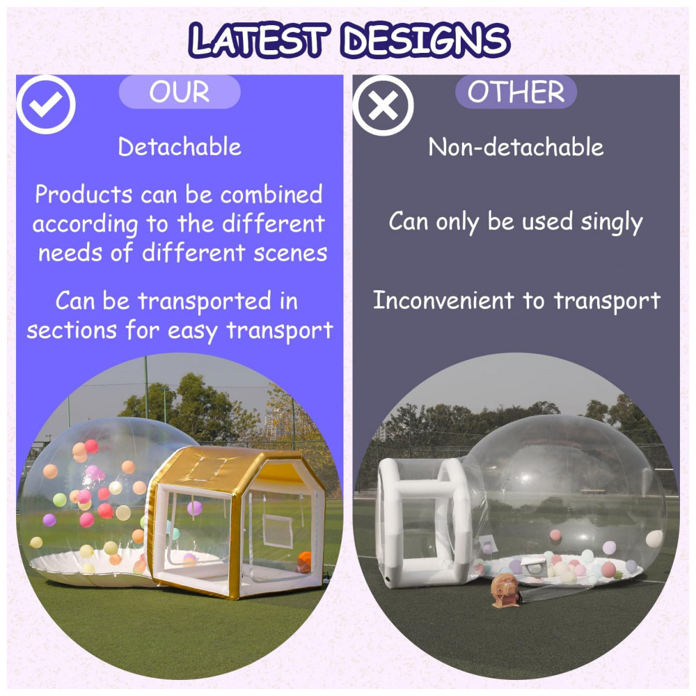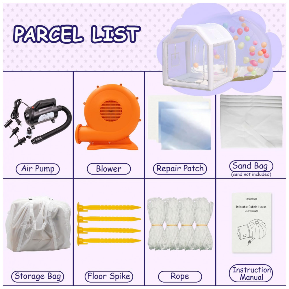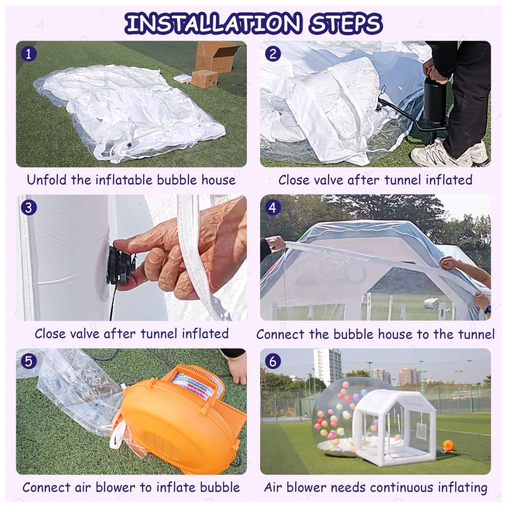 A espaçosa e durável casa de balão inflável com túnel acomoda até 35 adultos. Feita de tecido Oxford de qualidade comercial e PVC, oferece alta visibilidade, propriedades antiestáticas, resistência a rasgos e estanqueidade para uso prolongado. O design único inclui uma área de salto removível, que quando fechada as bolas rolam e flutuam dentro para brincadeiras. Pode ser usada como tenda independente. Perfeita para festas, celebrações e encontros. A montagem é rápida, com sopradores de 450W e 600W permitindo a instalação em apenas 56 minutos. Tanto as laterais da bolha quanto do colchão de ar possuem saídas de ar para desinflar rapidamente em 56 minutos. Segura e estável, com sacos de areia, estacas e cordas de amarração para manter a casa de balões inflável segura e estável, ideal para uso interno e externo. Dicas de uso: a tenda de bolha inflável precisa ser continuamente inflada durante o uso e evitar contato com objetos pontiagudos para evitar danos. Para manchas leves, limpe com detergente para manter sua aparência e limpeza.