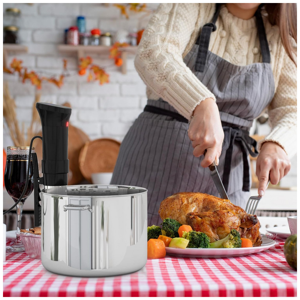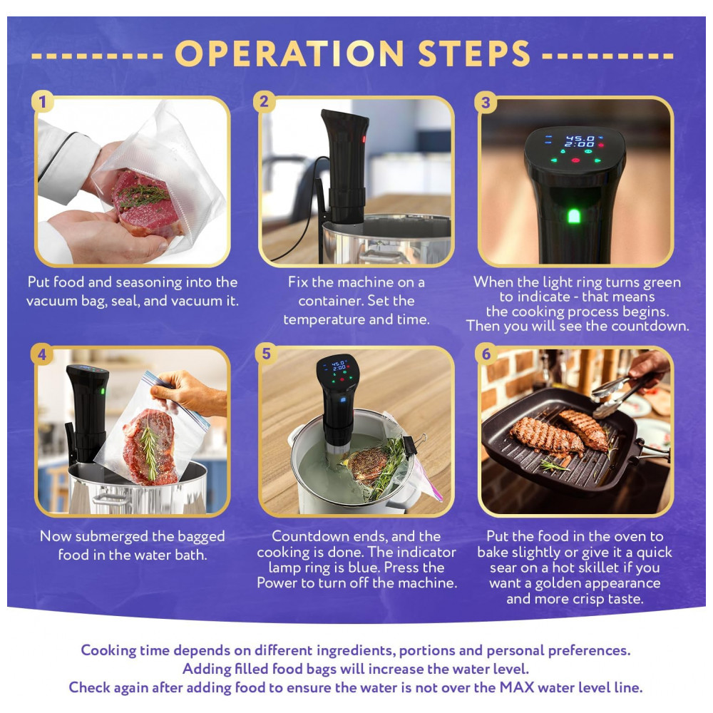 AQUECIMENTO CIRCULADOR RÁPIDO APQ sous vide aquece a água rapidamente, é mais rápido chegar à temperatura. Este mantém a temperatura uniforme e constante, ajuda a cozinhar os alimentos a uma temperatura específica. E o circulador aprimorado também pode lidar com banhos de água muito maiores para permitir cozinhar mais alimentos de uma só vez