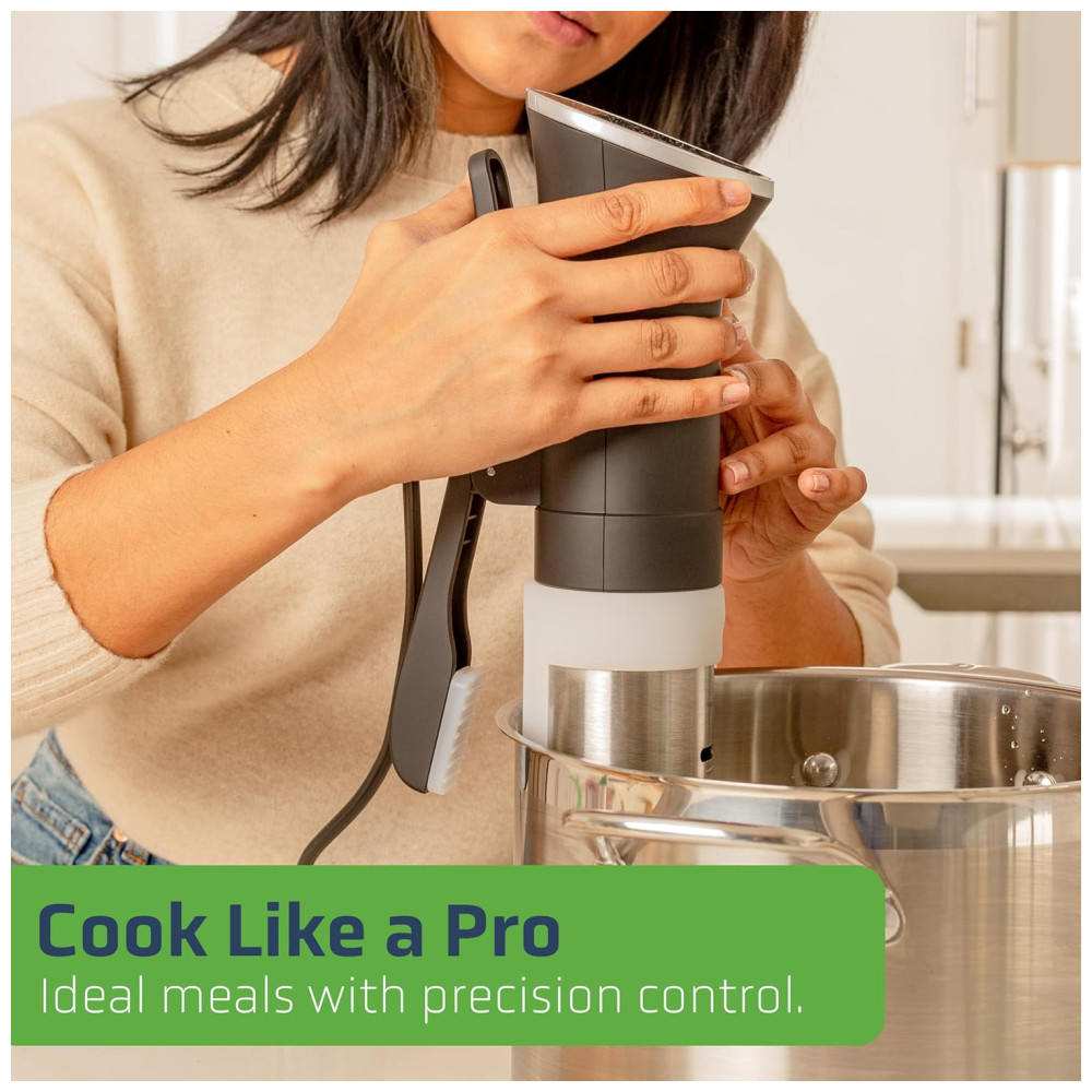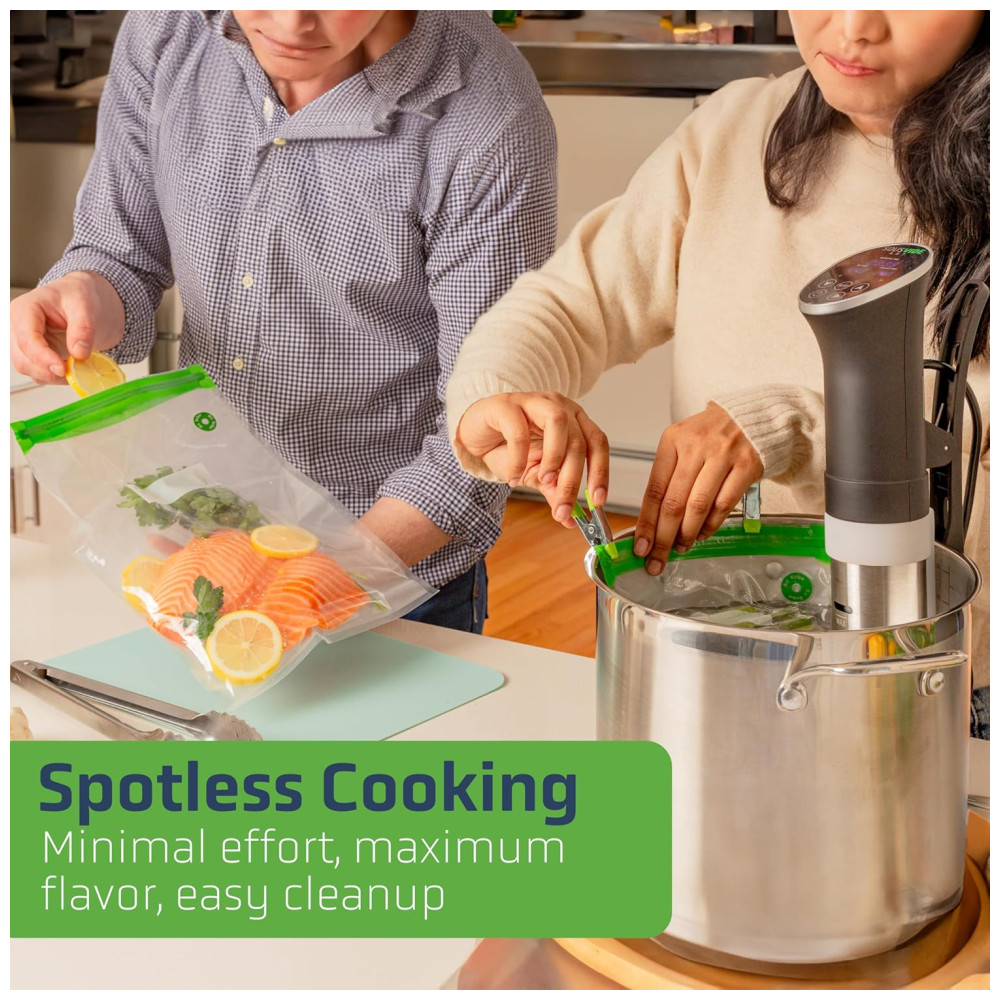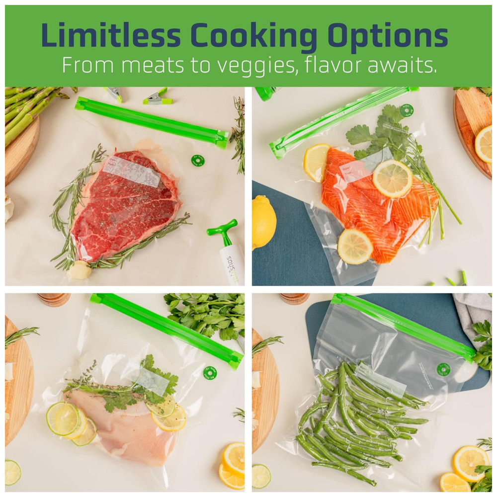 Tudo o que você precisa para começar a cozinhar como um profissional com o método sous vide está em nosso kit Sous Vide Pod, 15 sacos de vácuo reutilizáveis, bomba, clipes e livro de receitas