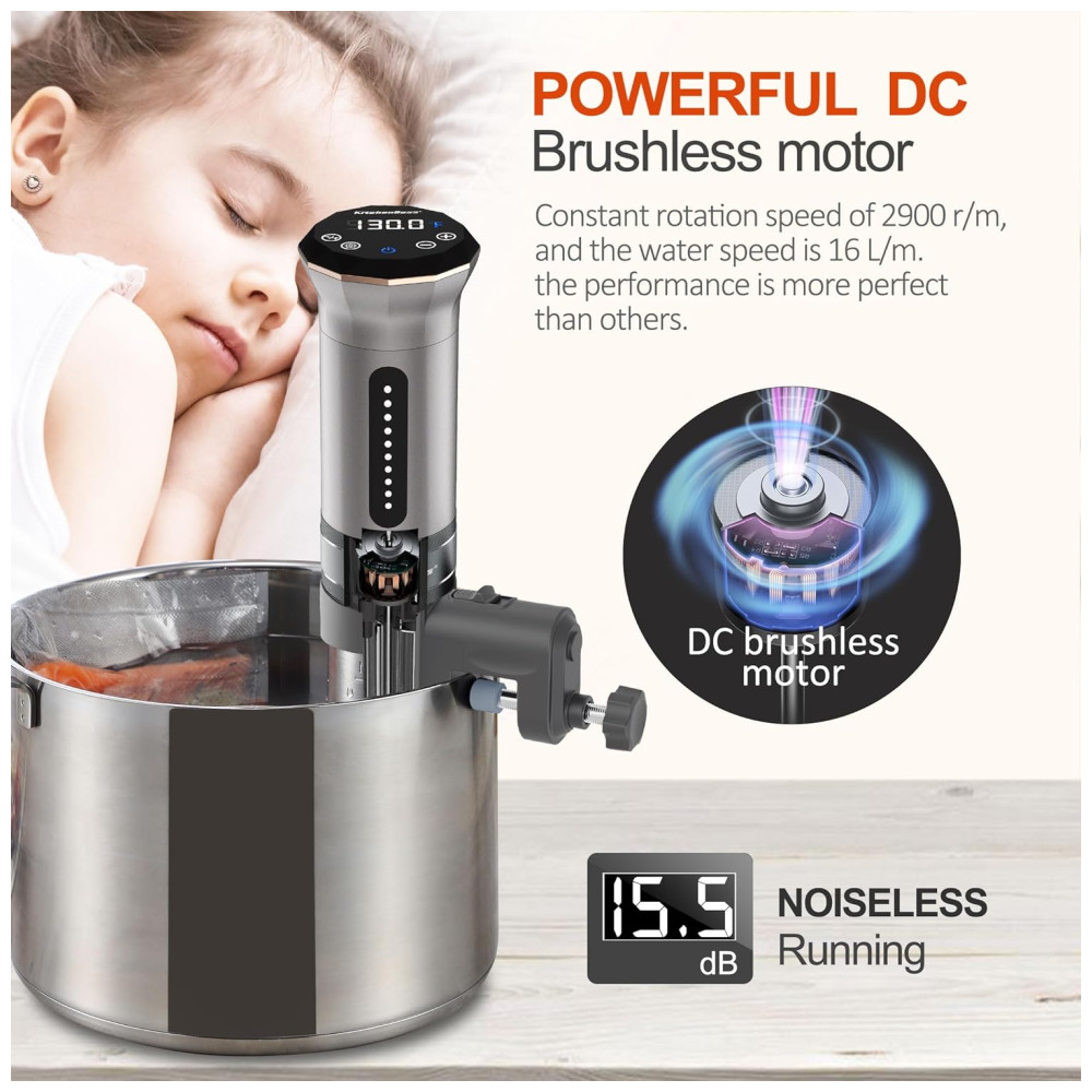 Super fluxo de água O sous vide adota design de fluxo de água de 16L , min, o que aumenta a velocidade de circulação interna da água e garante a estabilidade da temperatura em cada local. Assim, você pode colocar mais ingredientes na mesma panela ao mesmo tempo e não precisa se preocupar com o aquecimento desigual dos alimentos