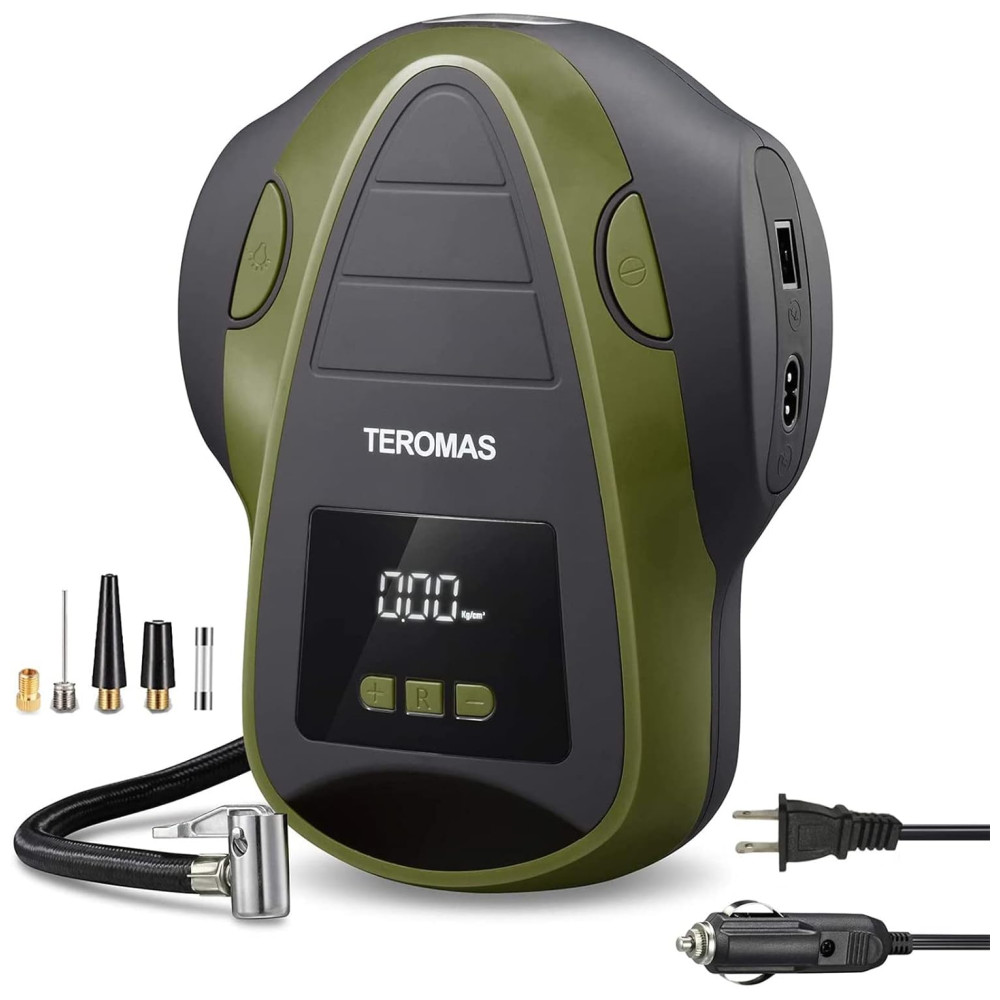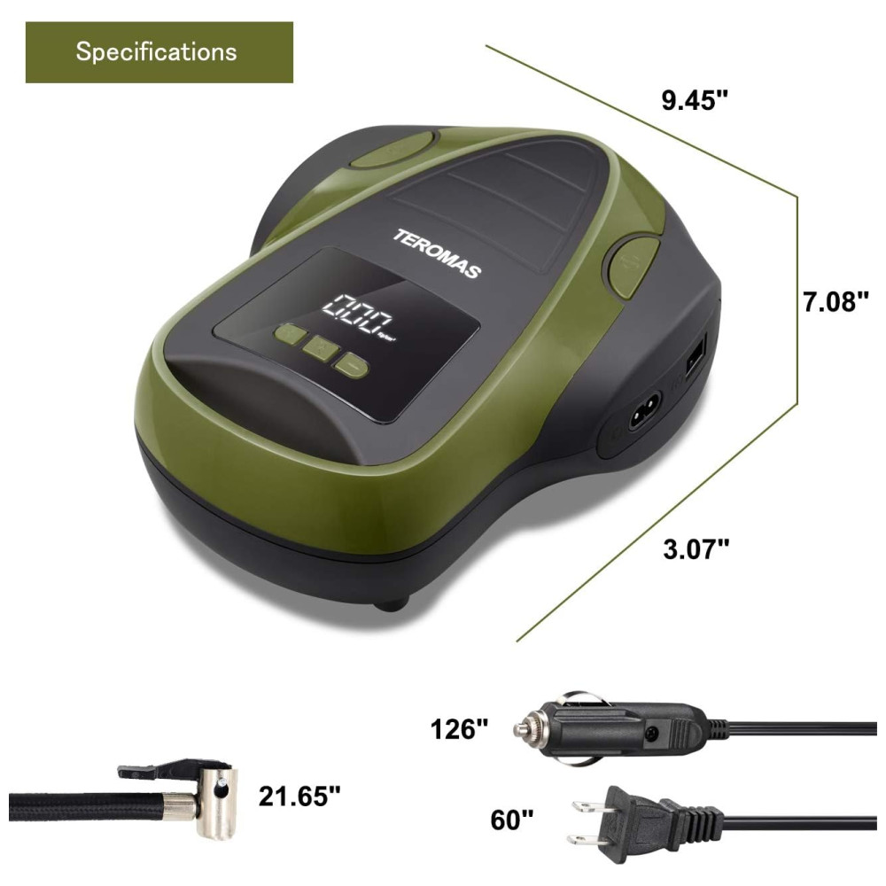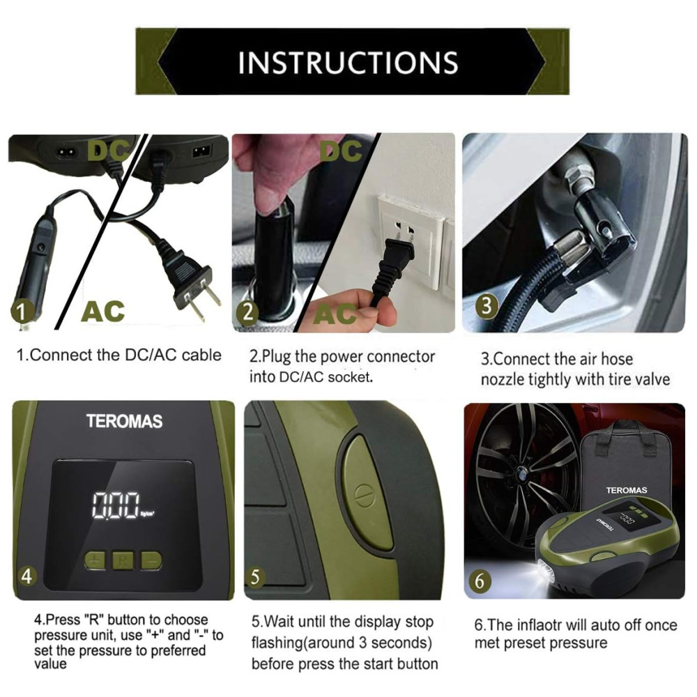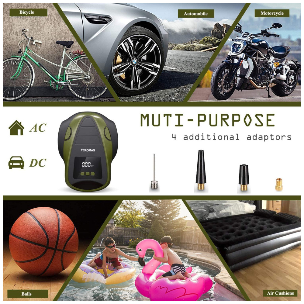 SAÍDA AC , DC MULTI FINALIDADE O inflador de pneus TEROMAS AC , DC exclusivo com plugue de luz de cigarro de carro de 12V, bem como plugue de parede 110 , 120V para tomada doméstica torna este inflador mais útil, pois você pode usá lo em qualquer lugar. Vem com 3 adaptadores adicionais que o tornam perfeito para carros, RV, motocicletas, pneus de bicicletas, colchão de ar, barcos infláveis, bolas e outros infláveis.