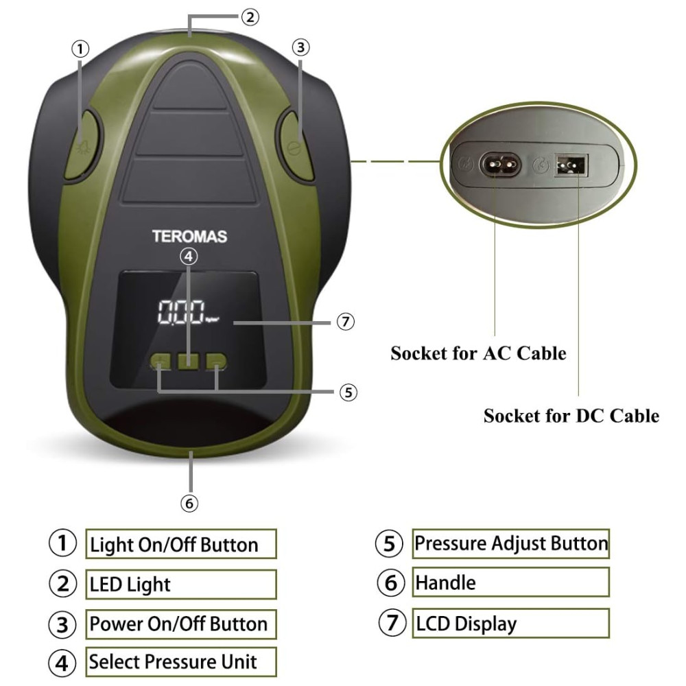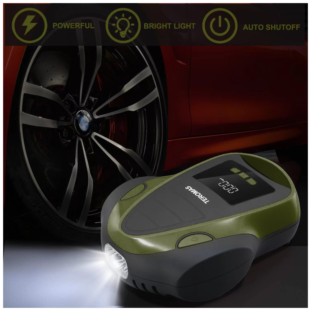 TELA DIGITAL E Iluminação LED A tela LCD com luz de fundo brilhante facilita o uso à noite. Além de ser brilhante o suficiente para ver sob forte luz do sol, o manômetro do compressor de ar pode exibir a pressão em PSI, BAR KG , CM. A bomba de ar TEROMAS está equipada com luzes LED brilhantes e duradouras, fáceis de usar mesmo no escuro