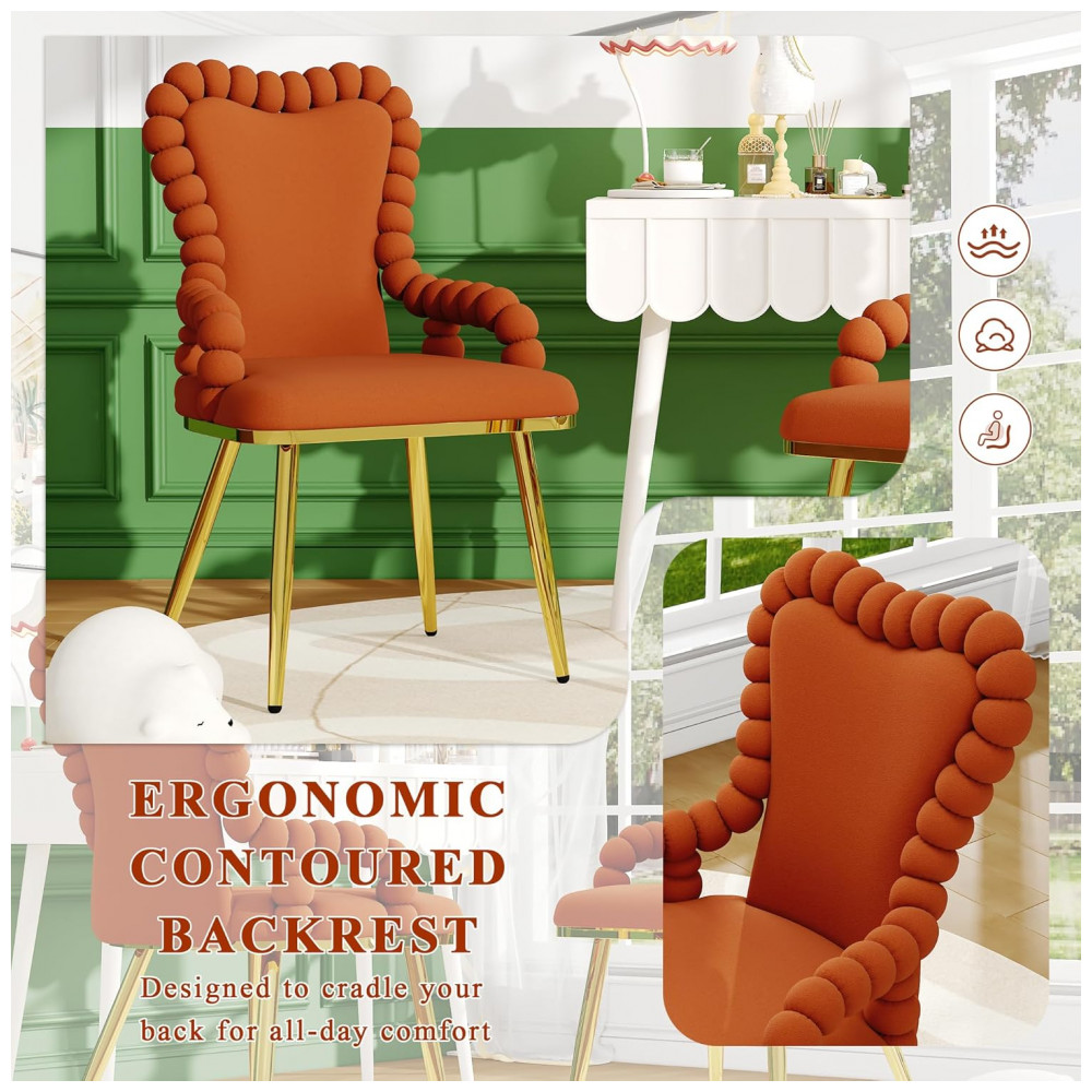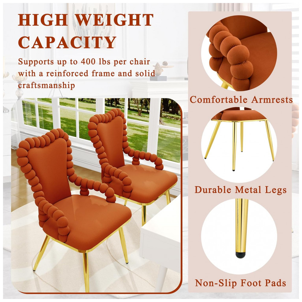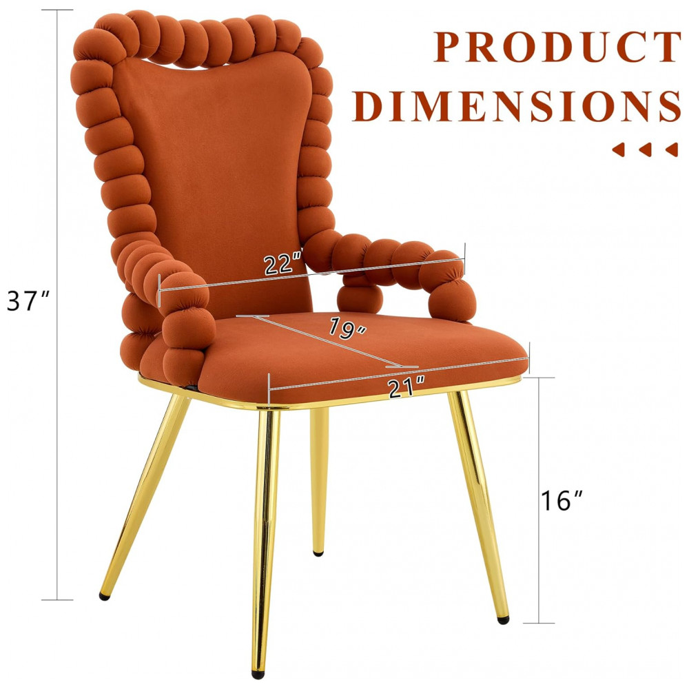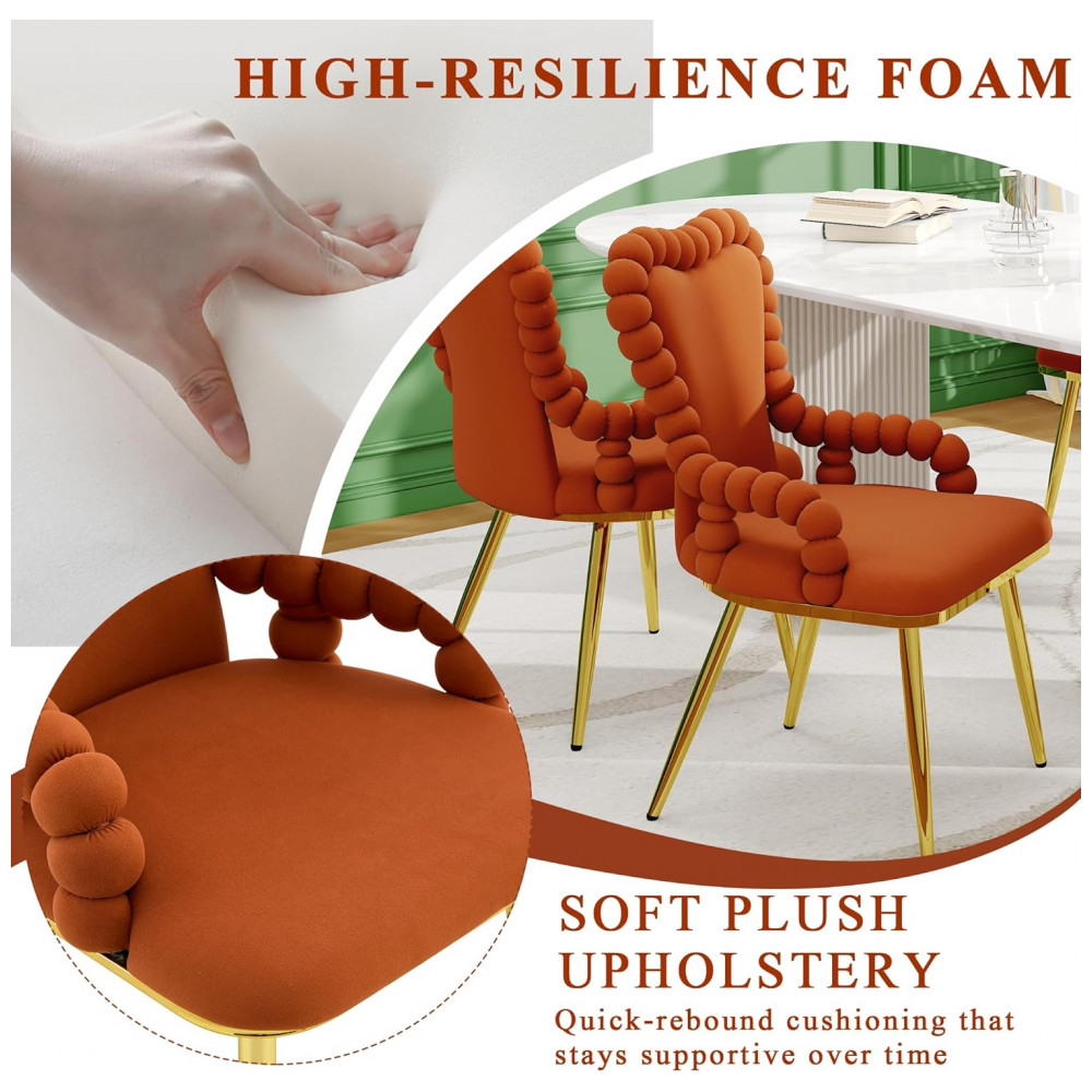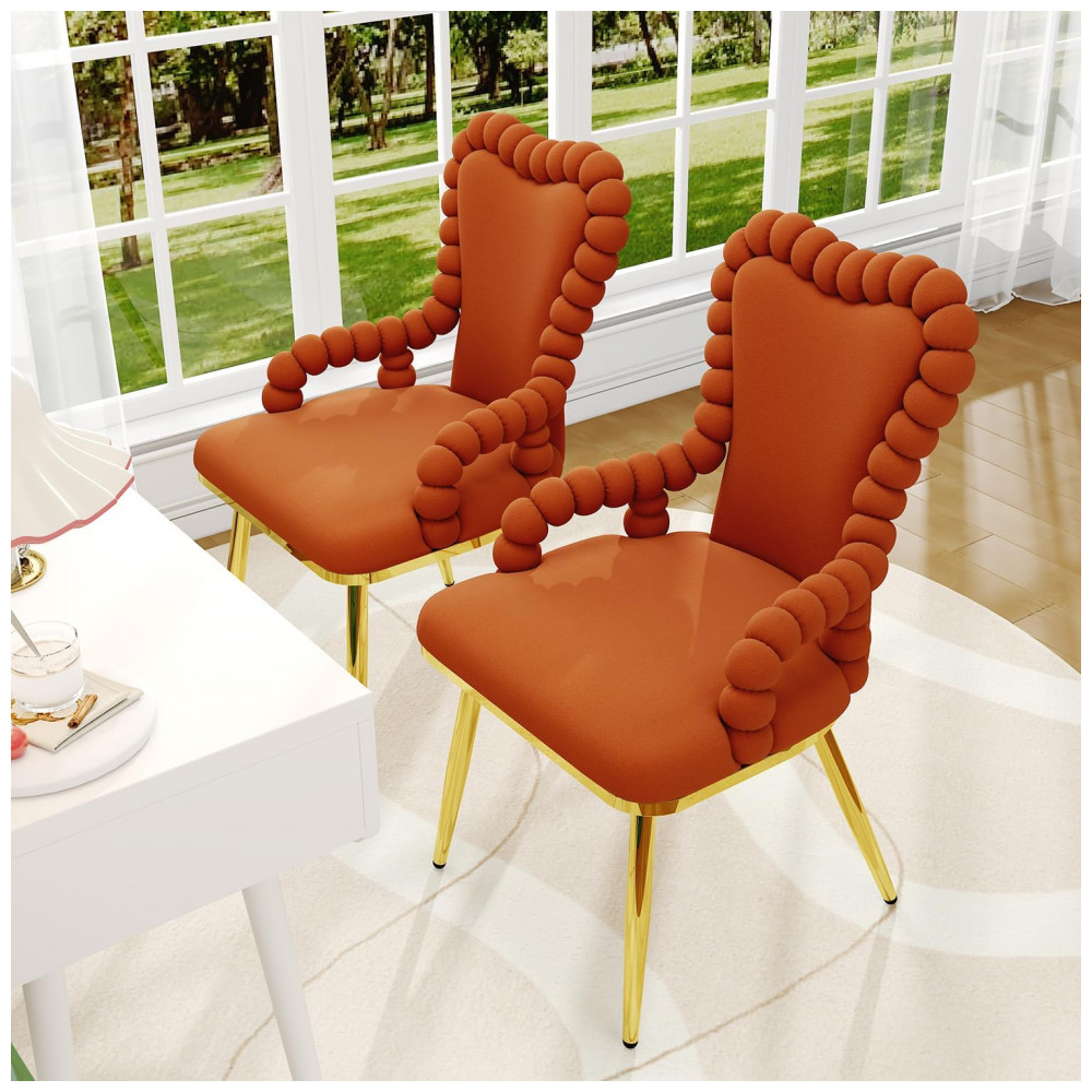 Versatilidade para Várias Ambientes – Seja como cadeiras de jantar, poltronas de destaque na sala ou assentos para penteadeira, essas cadeiras em veludo adicionam uma combinação perfeita de design moderno e conforto acolhedor. A cor laranja queimado com base dourada traz instantaneamente sofisticação e aconchego ao seu espaço.