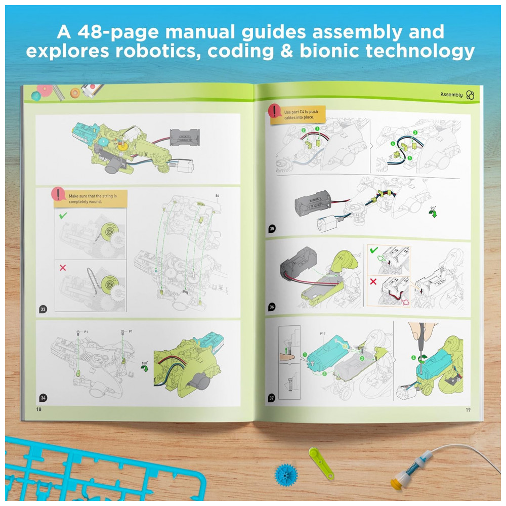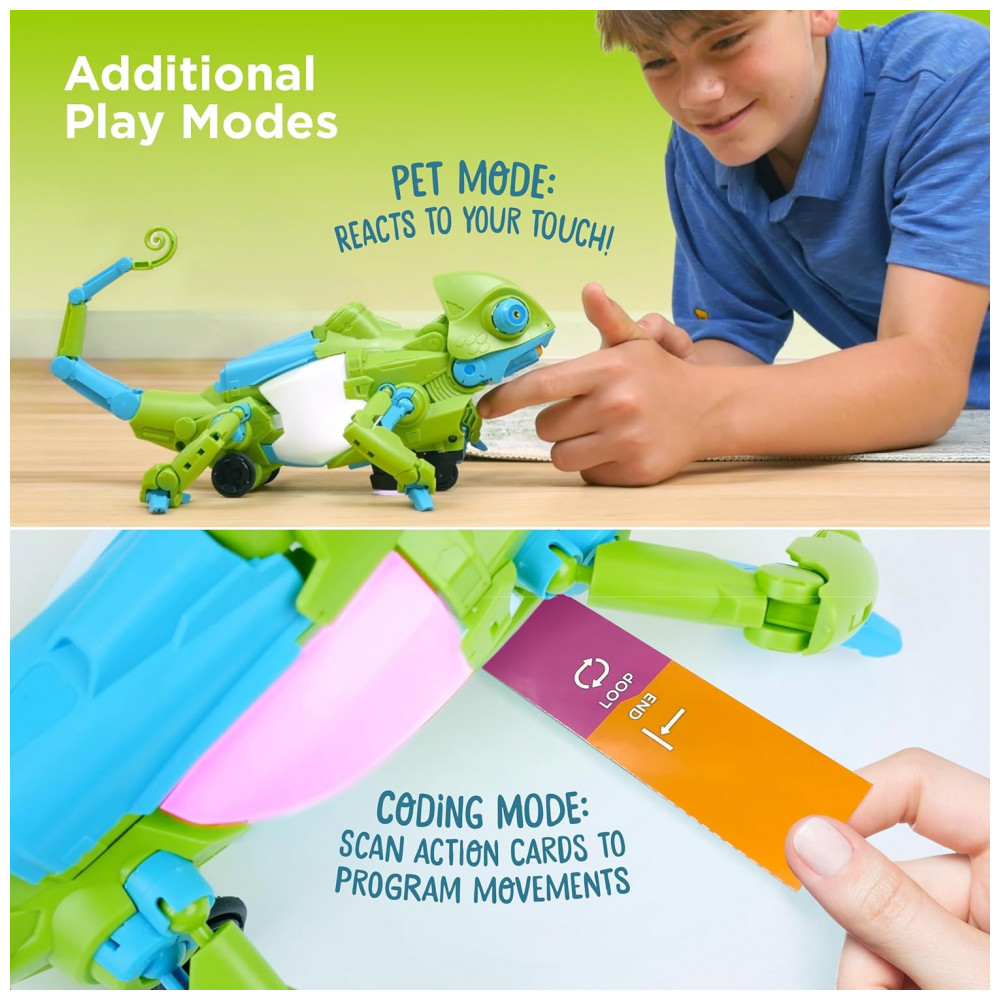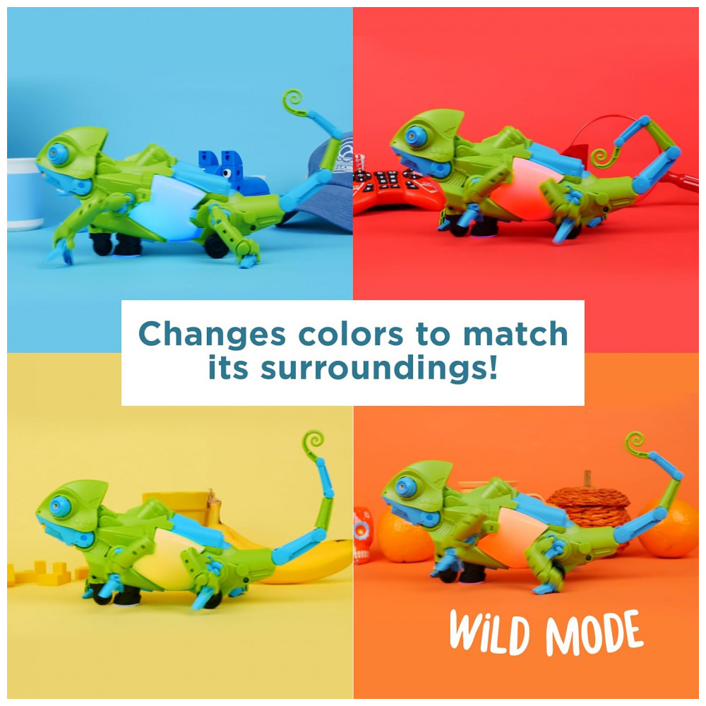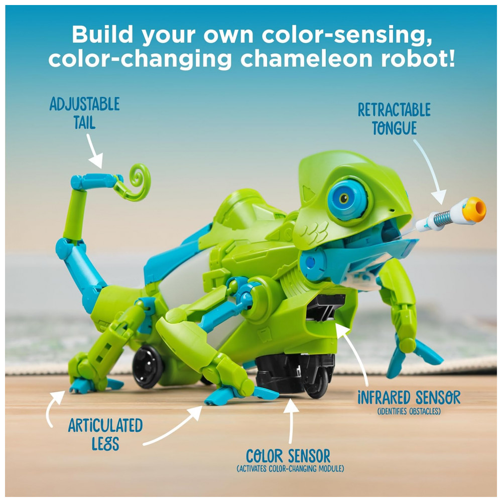 Construa um leal amigo robótico réptil que responde aos seus gestos, muda de cor e dispara e retrai a língua automaticamente! Este camaleão robótico único em seu tipo vem equipado com um sensor de cor, sensor infravermelho e LEDs RGB que permitem programar em três modos de jogo únicos. No Modo de Codificação, use os cartões de ação coloridos incluídos para programar seu pet para executar uma série de movimentos. No Modo Selvagem, o camaleão irá se camuflar e mudar de cor para se misturar ao ambiente, caçar possíveis presas e disparar sua língua contra objetos que possam ser um petisco delicioso! Por fim, no Modo Pet, seu amigo robô se torna amigável, caminhando em busca de você e demonstrando sua empolgação ao ser acariciado. Além de aprender como os componentes robóticos são utilizados em dispositivos do dia a dia, você também ganhará insights sobre como a biomimética se volta a sistemas naturais e orgânicos para inspirar, melhorar e resolver desafios de design de engenharia. CONSTRUA, PROGRAME, BRINQUE E APRENDA! Construa um amigo robô réptil que responde aos seus gestos, muda de cor e dispara e retrai a língua automaticamente! ENGENHARIA INOVADORA: O modelo de 15 polegadas de comprimento, projetado por especialistas, inclui olhos articulados, torso e articulações nas pernas para simular movimentos realistas. TOTALMENTE EQUIPADO PARA LIÇÕES DE CODIFICAÇÃO SEM TELA: O robô utiliza um sensor de cor, sensor infravermelho e LEDs RGB que permitem às crianças usar cartões de ação coloridos físicos para programar o robô para se mover e reagir de diferentes maneiras – sem telas, dispositivos ou software! TRÊS MODOS DE JOGO ÚNICOS: No Modo de Codificação, use os cartões de ação para programar seu pet para executar uma série de movimentos; no Modo Selvagem, o camaleão irá se camuflar e mudar de cor para se misturar ao ambiente; no Modo Pet, este réptil robótico exclusivo reage ao seu toque! APRENDIZAGEM AUTÊNTICA COM GUIA COMPLETO: O manual de 48 páginas guia as crianças durante a montagem (a partir de 8 anos, com ajuda de um adulto; 12 anos para brincar de forma independente), incentiva a exploração dos componentes robóticos e ensina como a natureza pode inspirar, melhorar e resolver problemas de design de engenharia.