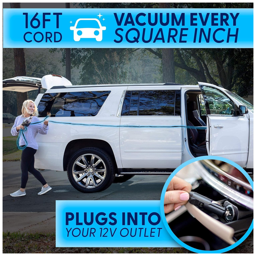PODEROSO AINDA MINÚSCULO Nosso vácuo portátil pesa apenas 1 kg, mas tem um motor de alta potência, 106W e 8,eres e turbina de metal para o máximo em potência de sucção. O cabo de alimentação de 5 metros se conecta à porta do isqueiro de 12 V do carro, para cobertura máxima