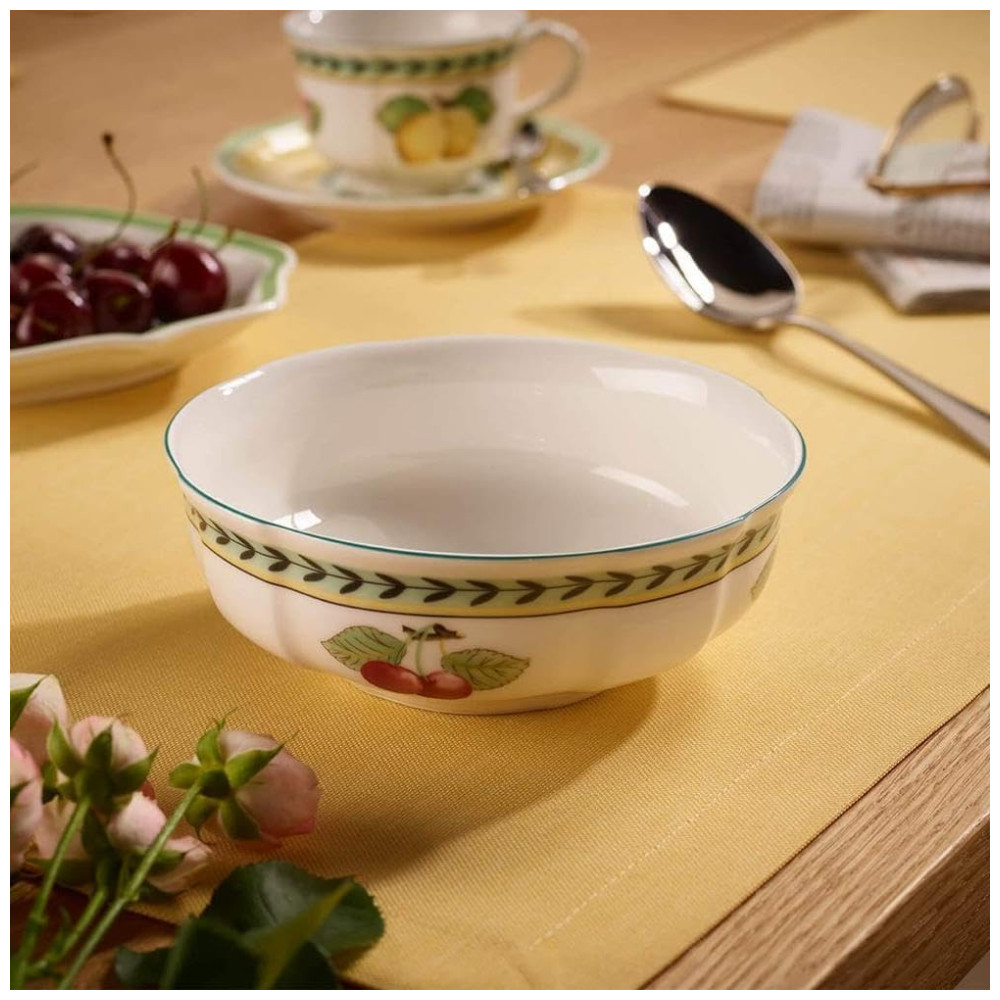 Sua beleza a destaca e complementa perfeitamente a coleção French Garden Fleurence. Além disso, a tigela é prática para serviços de buffet, pois é empilhável e possui bordas resistentes a choques e impactos. Feita de porcelana premium de alta qualidade na Alemanha, pode ser lavada na máquina de lavar louça e aquecida no micro-ondas.