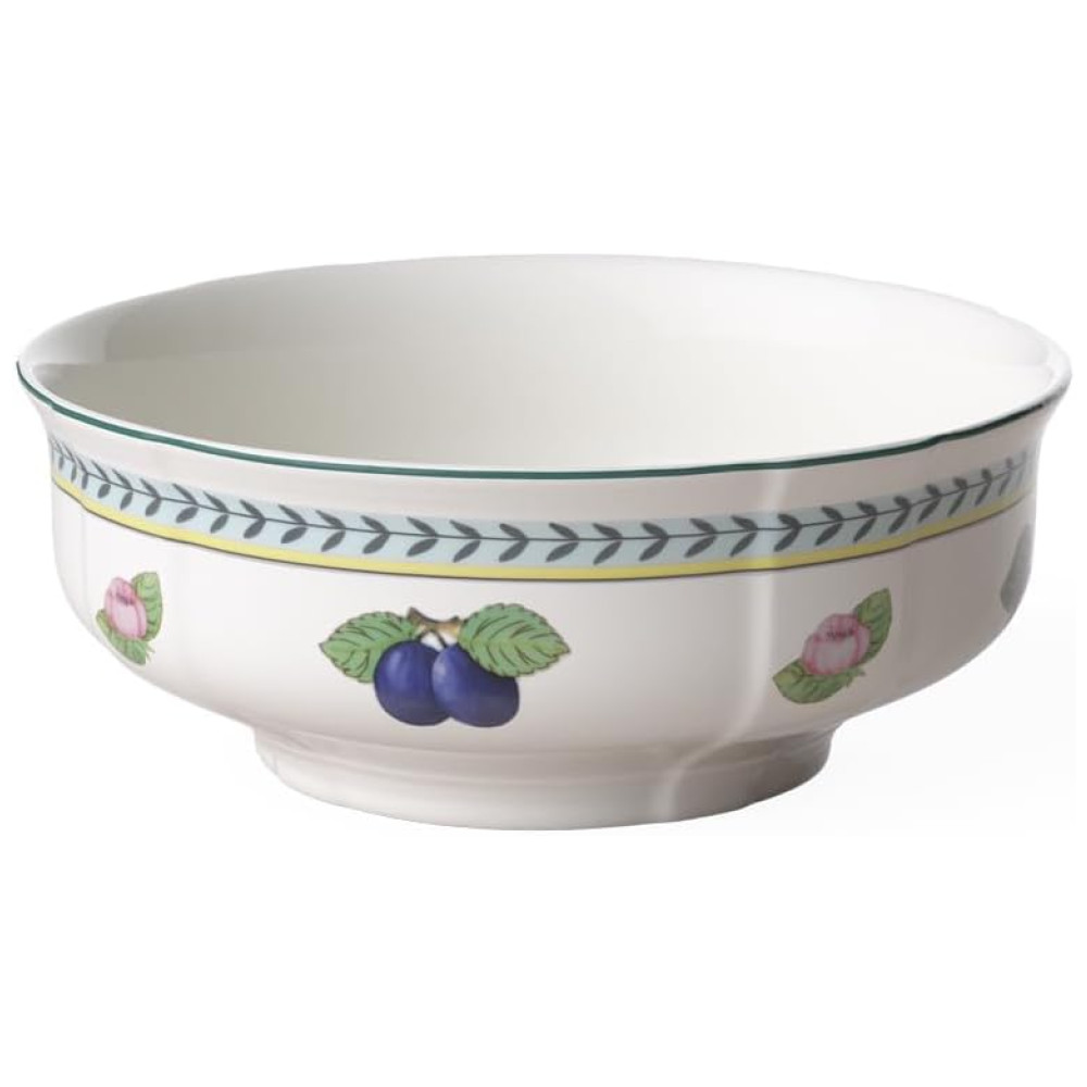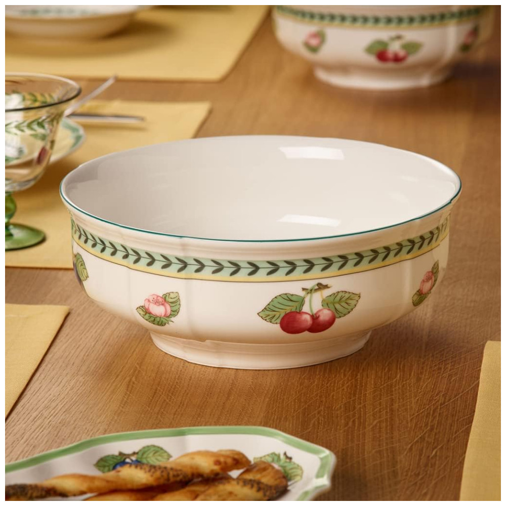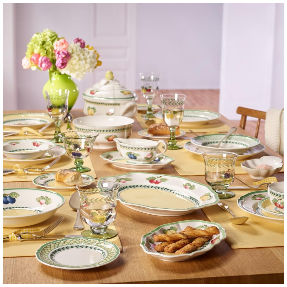 O padrão Fleurence da Villeroy Boch é uma verdadeira obra de arte, com cachos de frutas e flores de cerejeira, anéis de folhas de louro em verde profundo, e delicadas faixas em amarelo suave e celadon claro, criando a sensação refrescante de um jardim arejado.