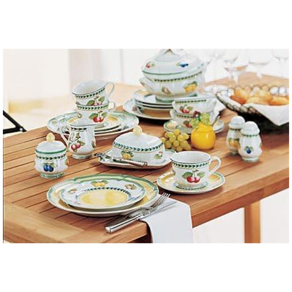 Com 21 cm de diâmetro e 7,5 cm de altura, a tigela repousa sobre uma pequena base e é decorada com limões, cerejas, ameixas, maçãs e flores de cerejeira, com folhas de louro contornando a borda externa. Além disso, seu formato prático e empilhável, aliado às bordas resistentes a choques e impactos, a torna ideal para catering e serviços de buffet. Fabricada na Alemanha com porcelana premium de alta qualidade, esta tigela combina beleza e funcionalidade de maneira excepcional.