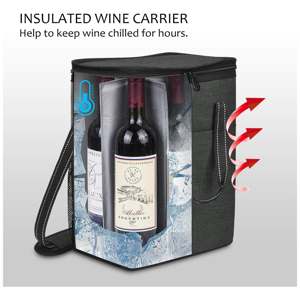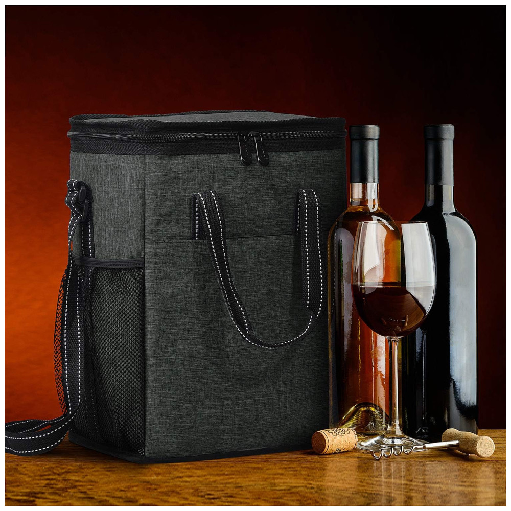 SACOLA DE VINHO RESISTENTE Quase qualquer garrafa de vinho vai caber, incluindo garrafas de leite , cerveja ou garrafas de champanhe também. Boa costura e bons fechos. Muito inteligente e parece elegante também Não só é funcional para manter a efervescência com blocos de freezer dentro, mas também é fácil de transportar com a alça