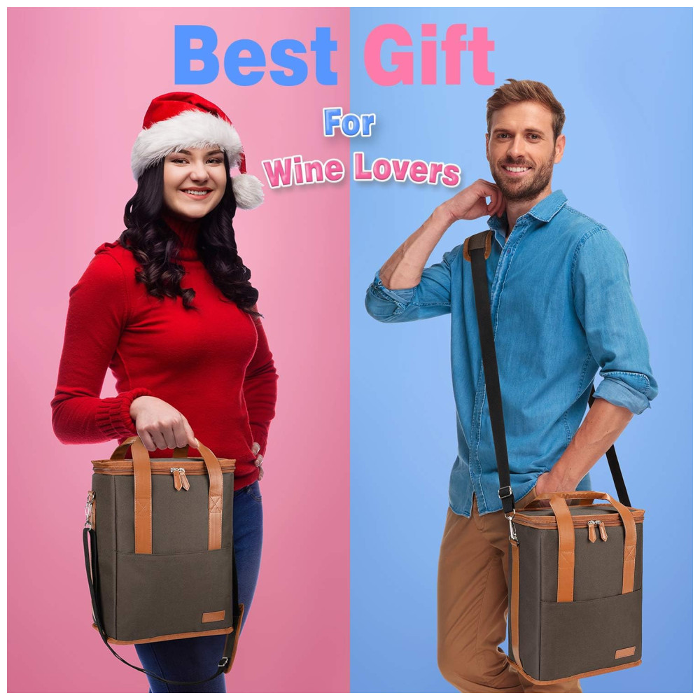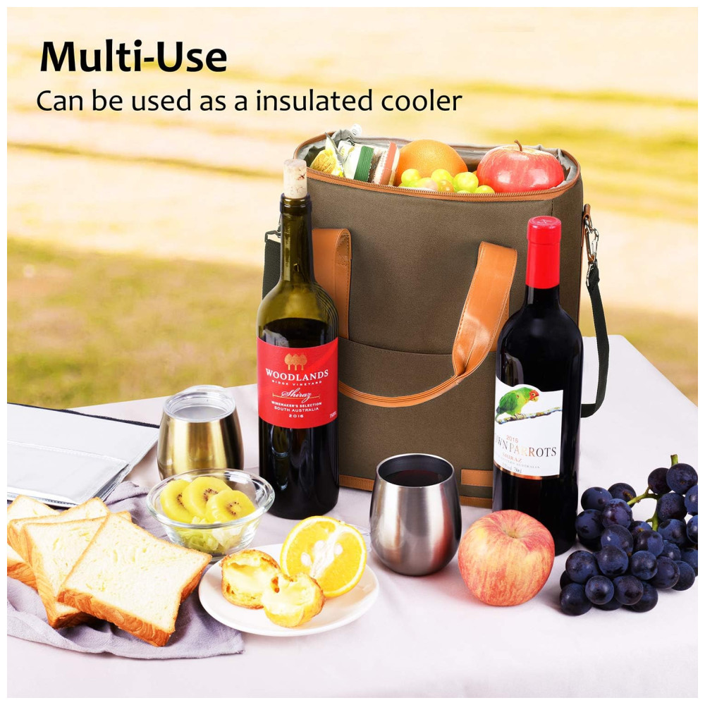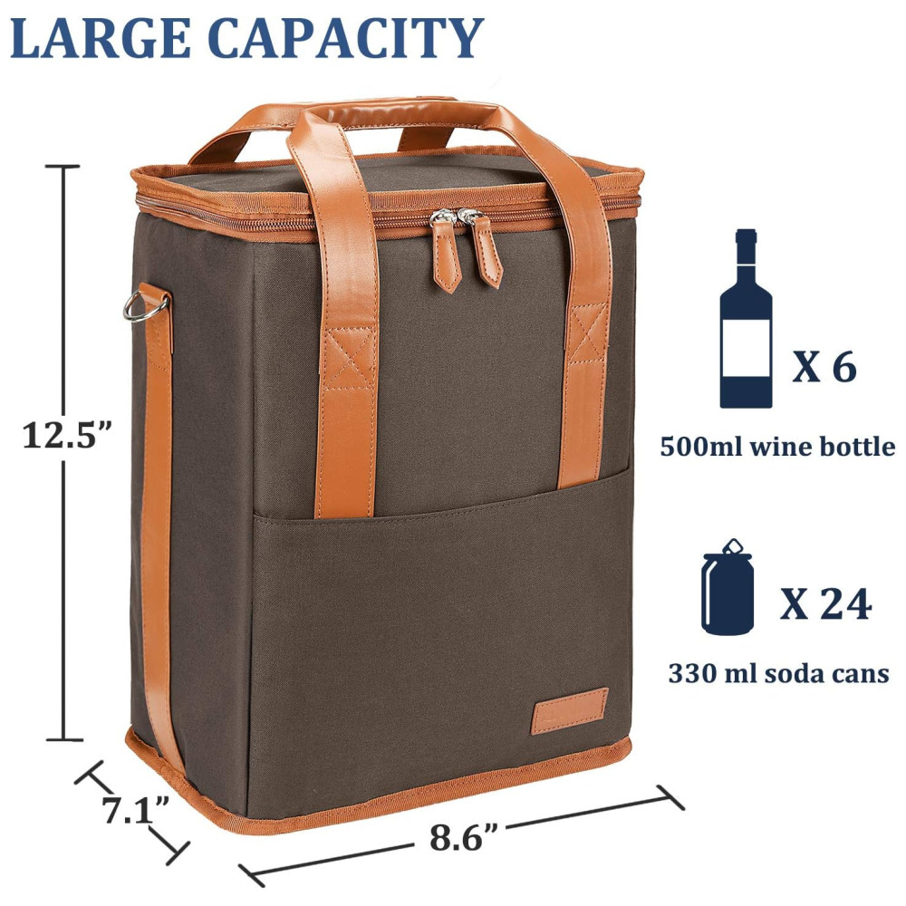 ACOLCHOADO E ISOLADO TÉRMICO Material com isolamento térmico de PU e enchimento de espuma PE de 5mm protegem suas garrafas de vinho de colisões externas, mantenha 6 garrafas de vinho intactas e bem refrigeradas por horas.
