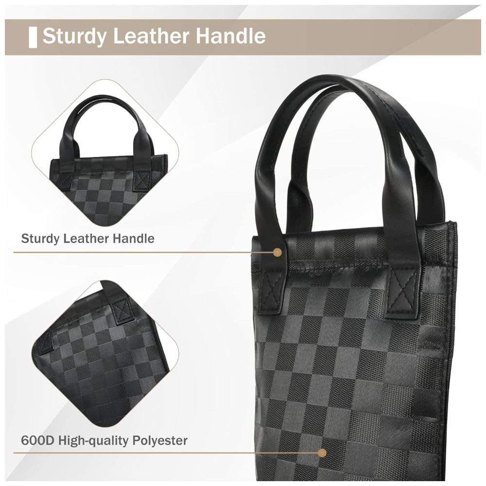 Desfrute do Melhor Sabor! Com a bolsa térmica para vinho da Tirrinia, você não precisa se preocupar com a perda de sabor devido a viagens prolongadas. Seu revestimento interno de alumínio mantém o vinho fresco. Leve para Qualquer Lugar! Esta bolsa para garrafa de vinho é leve, fácil de selar e cabe uma garrafa de 750ml perfeitamente. Com alça resistente, é ideal para piqueniques, festas e viagens. Estilo Duradouro! Feita de poliéster 600D, esta bolsa é durável e robusta. A alça de couro de alta qualidade melhora o design, enquanto o padrão clássico mostra sua elegância. Mais que uma Bolsa de Vinho! Além de manter o vinho gelado, o isolamento em folha de alumínio e o enchimento de espuma PE de 5 mm também mantêm cervejas, refrigerantes e água frios. Presente Perfeito! Esta bolsa combina funcionalidade e elegância, sendo a escolha ideal para presentear amigos e casais, independentemente da estação.