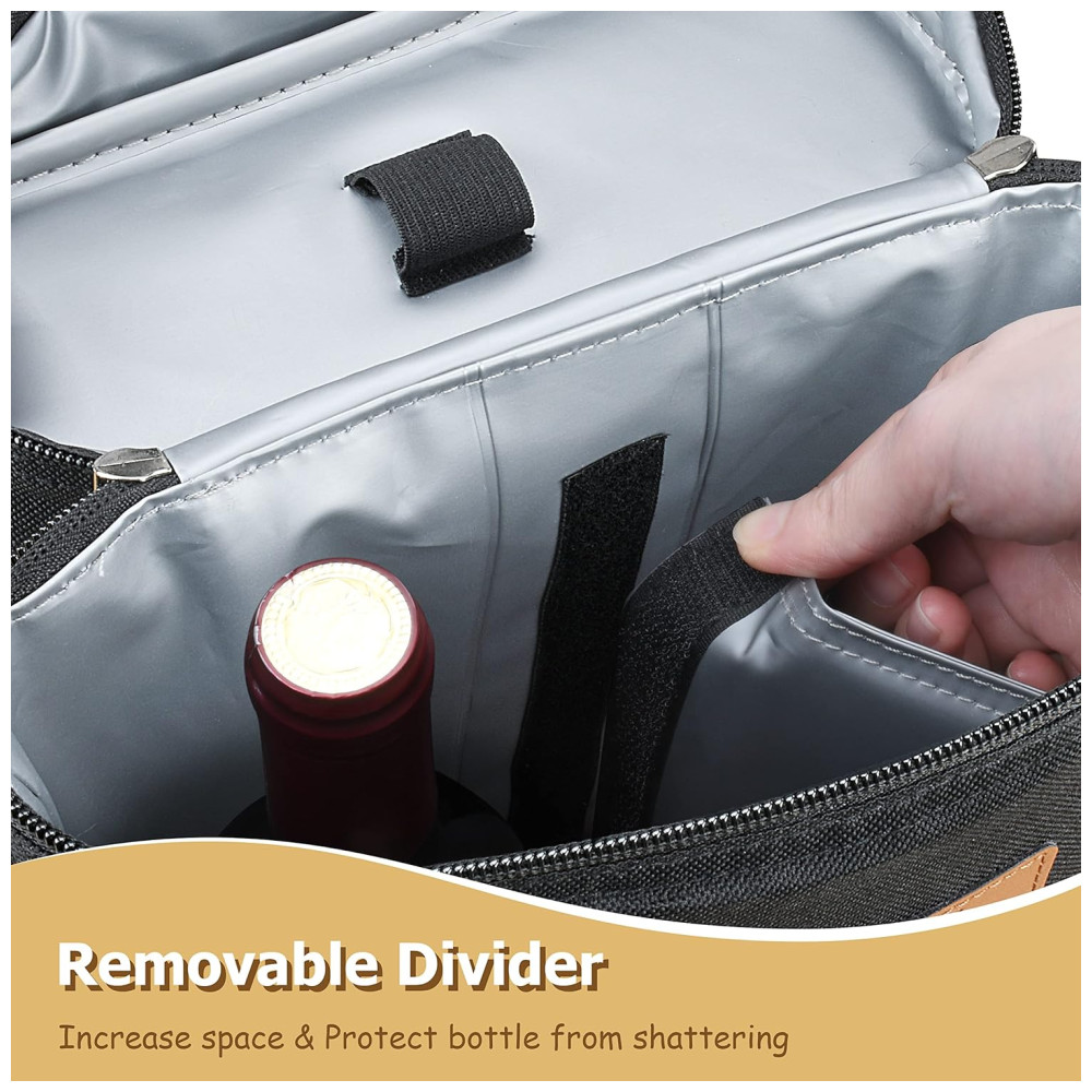 PROTEJA SUA GARRAFA DE VINHO DE QUEBRAR A divisória interior acolchoada mantém 2 garrafas de vinho separadas e evita que elas colidam e batam umas com as outras. Também é dobrável, você pode usar a bolsa de vinho como uma bolsa térmica isolada para transportar água, bebida ou cerveja.