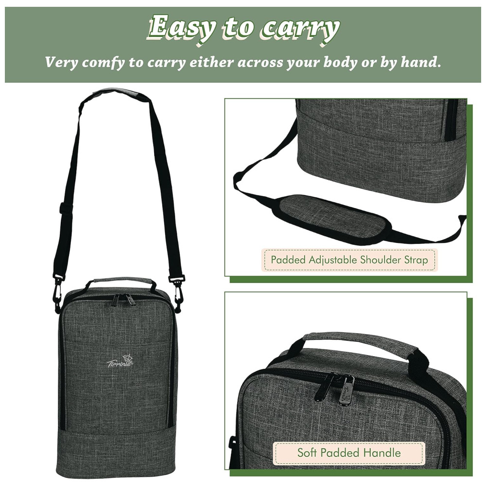 VERSÁTIL A divisória acolchoada interna mantém 2 garrafas de vinho separadas e evita que elas batam uma na outra. Também é flexível, você pode usar a bolsa de vinho como uma bolsa térmica isolada para transportar água, bebida ou cerveja