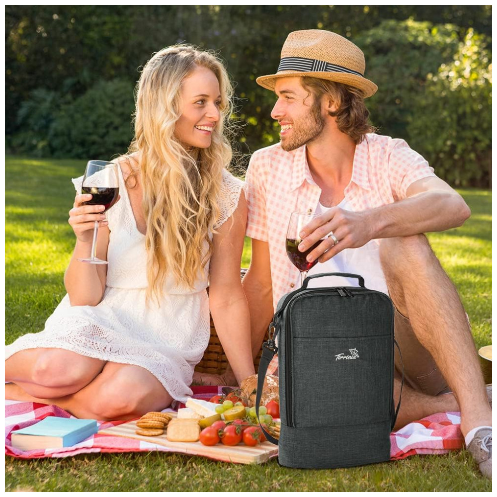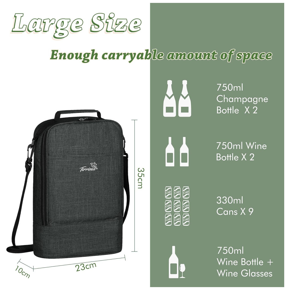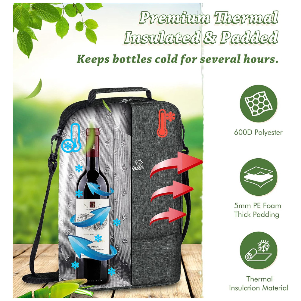 ACOLCHOADO E ISOLADO TÉRMICO Material com isolamento térmico de PU e enchimento de espuma PE de 5mm protegem suas garrafas de vinho de colisões externas, mantenha 2 garrafas de vinho intactas e bem refrigeradas por horas.