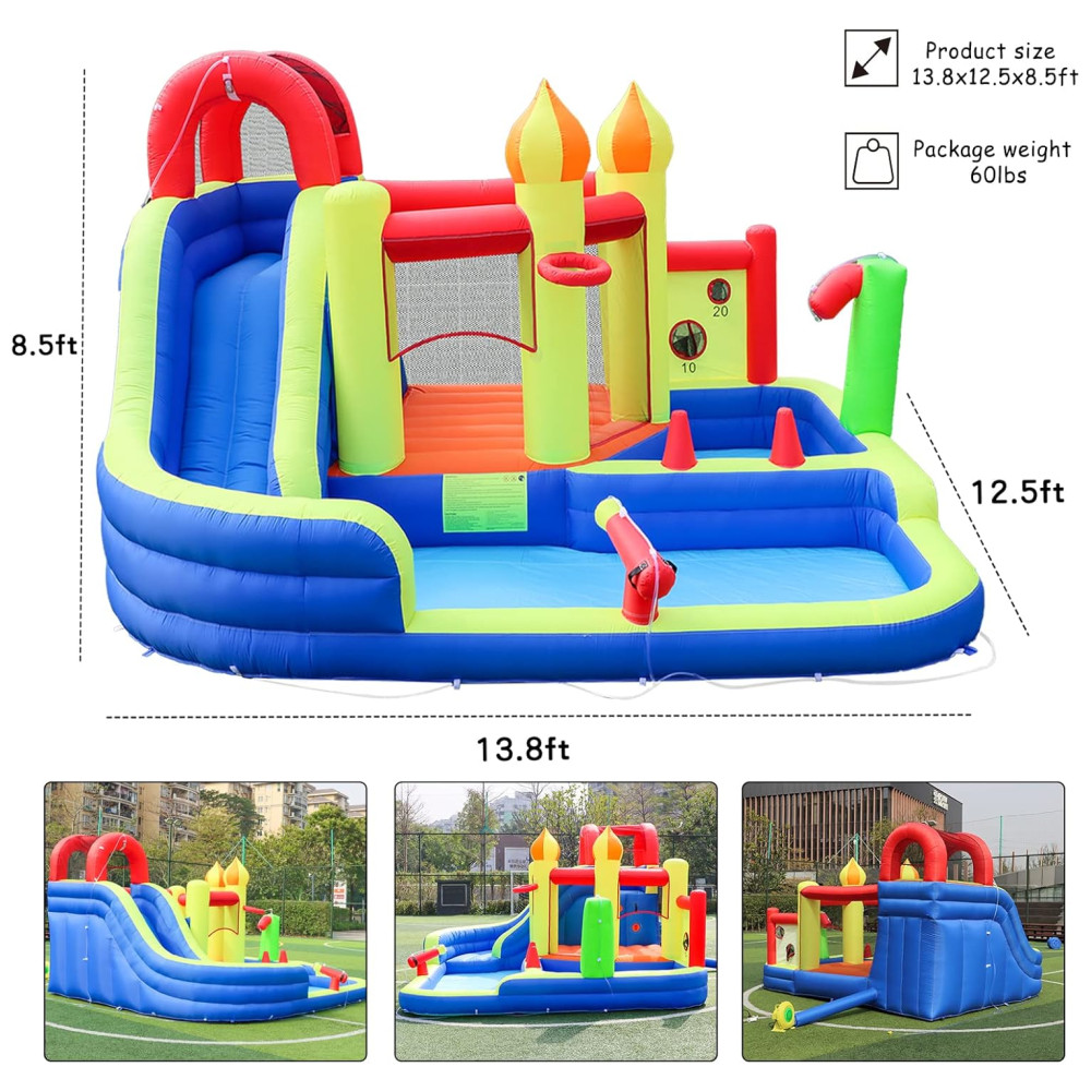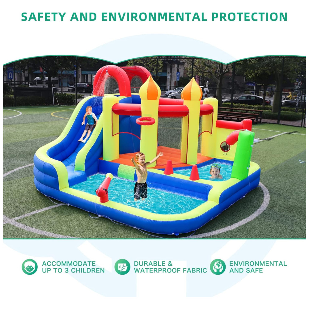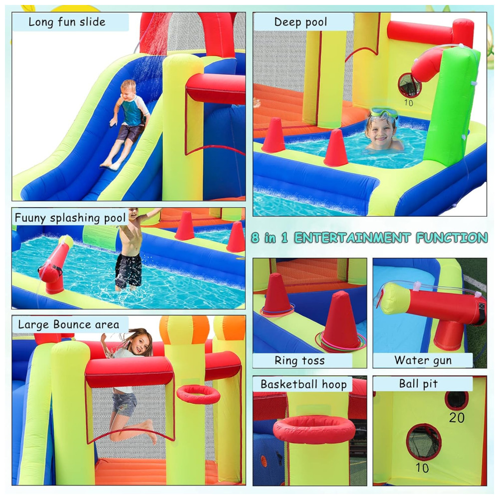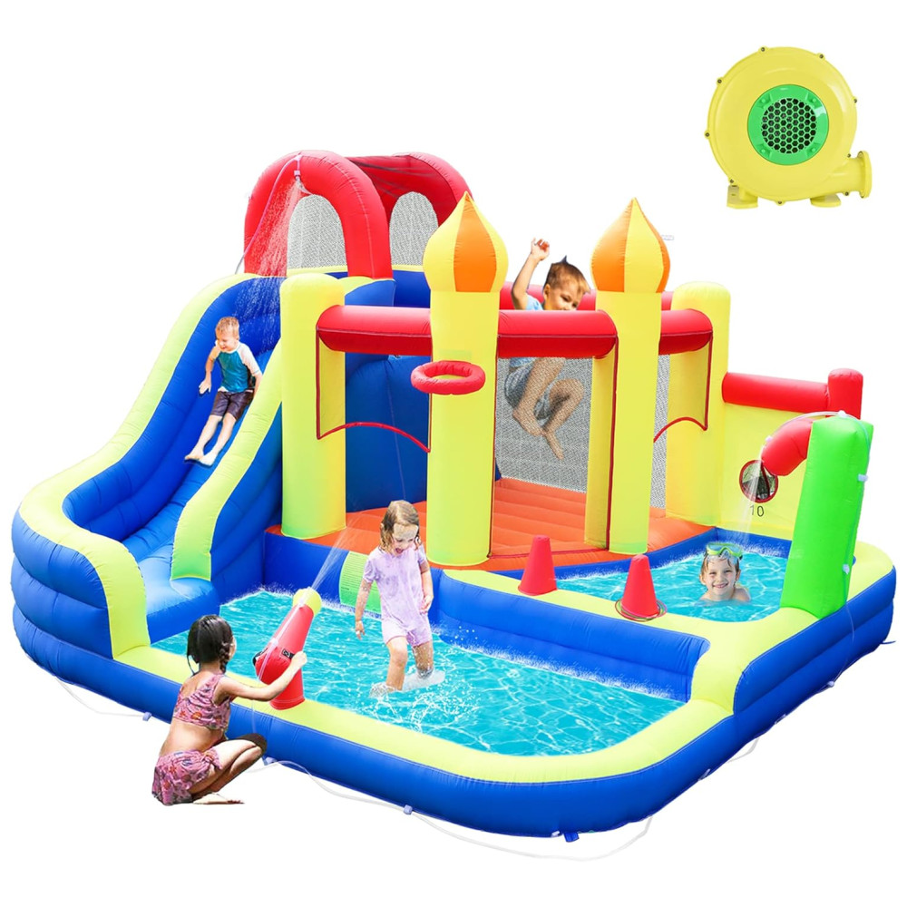 Tobogã Inflável para Crianças com Pulverizador Casa de Pulos Grande para Diversão ao Ar Livre Castelo Saltitante 8 em 1 com Compressor de Ar 450W