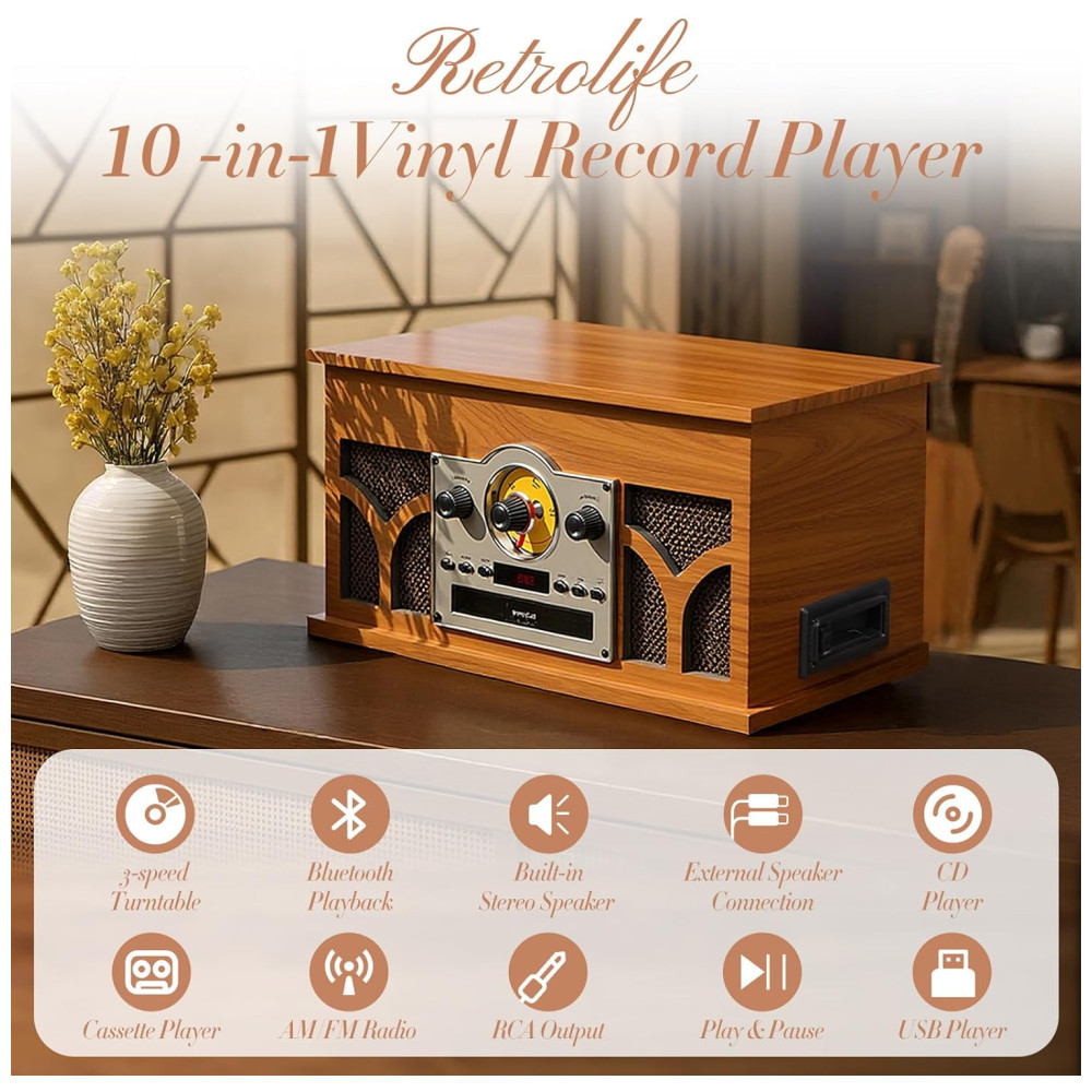 Toca-discos 10 em 1 com Alto-falantes Integrados e Reprodução sem Fio MahoganyRetrolife