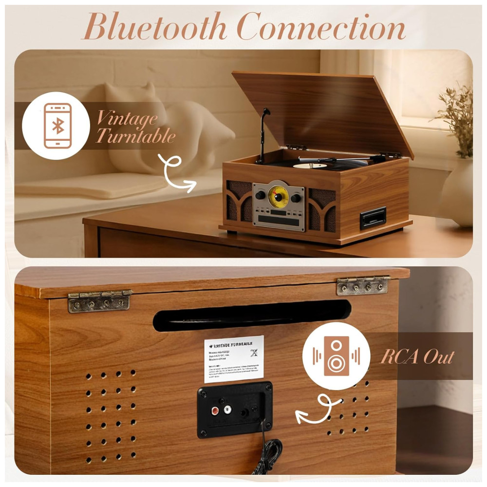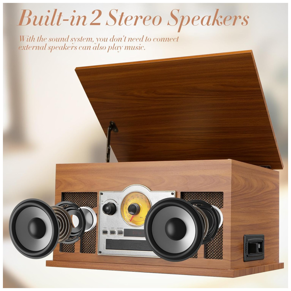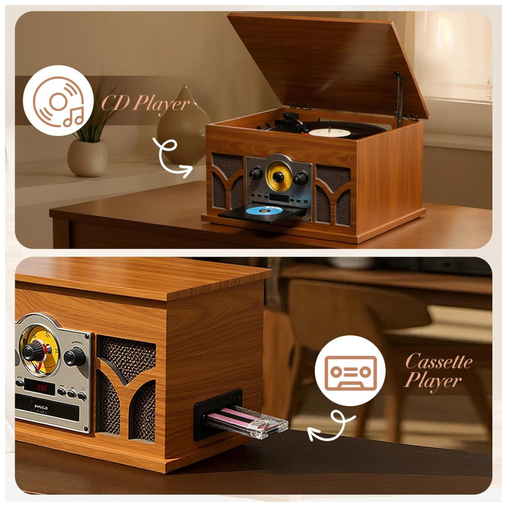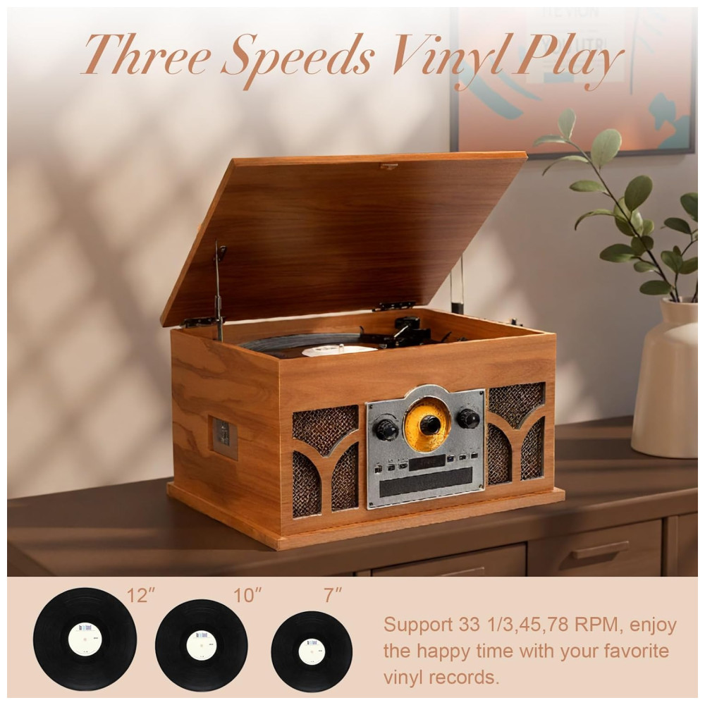 Este toca-discos 10 em 1 é a solução completa para todas as suas necessidades de reprodução. Além de reproduzir discos com três velocidades, ele também oferece reprodução Bluetooth, reprodução de CD, reprodução de fita cassete, reprodução USB e permite a conexão com alto-falantes externos via conexão RCA. Com dois alto-falantes estéreo embutidos, proporciona excelente qualidade de som tanto para a reprodução de discos quanto para a reprodução via Bluetooth. Você pode conectar o toca-discos ao seu celular e outros dispositivos para ouvir suas músicas favoritas. A aparência requintada com caixa de madeira maciça e grade de tecido fino confere a este toca-discos um visual vintage e durável, sendo uma ótima opção para os amantes de vinil. Além disso, o acionamento por correia com três velocidades permite uma rotação mais estável do prato, podendo reproduzir discos em 33 1/3, 45 e 78 rpm.